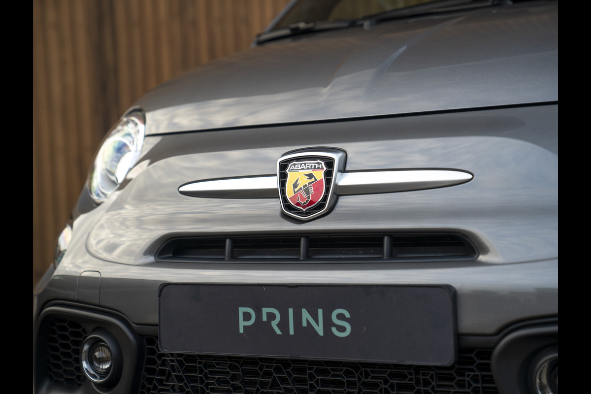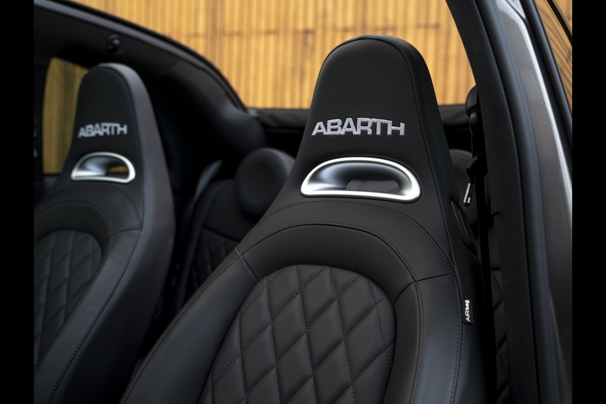 Nieuw binnen: chique Abarth 595 C Turismo in het Grigio Record met een Nero lederen interieur met diamond stitching.