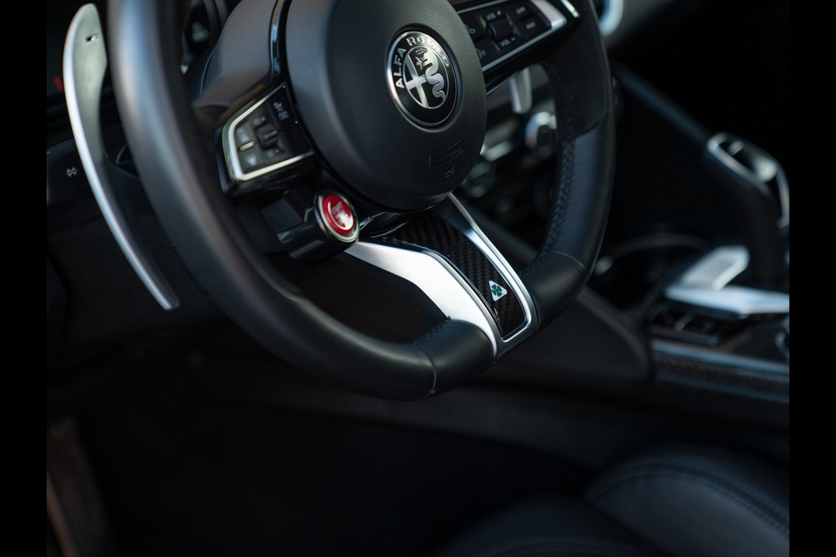 Nieuw binnen: Giulia Quadrifoglio My22 in het Grigio Vesuvio met een Nero lederen interieur.