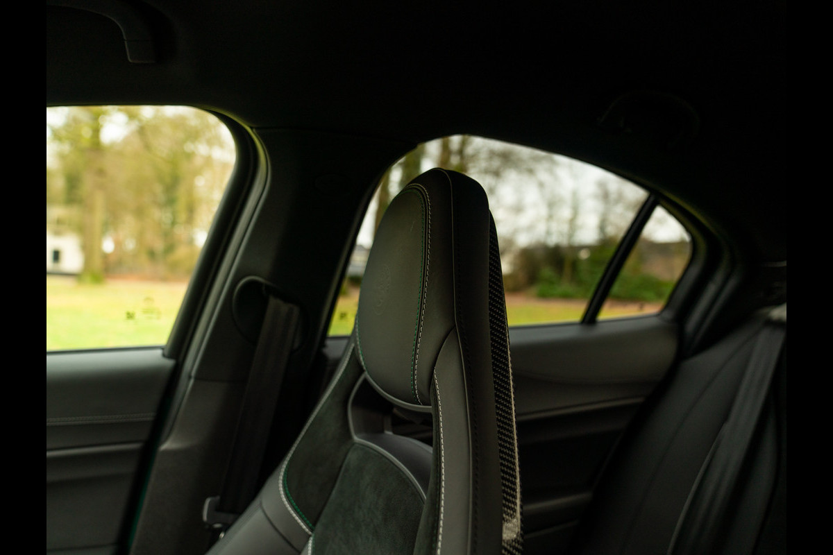 Sportsedans met een ziel worden niet ‘zomaar’ met uitsterven bedreigd. Nu de Alfa Romeo Giulia Quadrifoglio officieel uit productie is gehaald, zijn ze definitief ter ziele gegaan. Lang kunnen we daar niet treurig over zijn, want… Zie hier een hele jonge Alfa Giulia Q: de laatste der Mohikanen! Compleet met de meest recente specificatie en meest gewilde opties, waaronder: carbon sportstoelen van Sparco, een Akrapovič uitlaatsysteem, Harman Kardon audio en heel veel meer. En hoe mooi is het dan dat ze dit alles in een Verde Montreal vat hebben kunnen gieten? Leve de sportsedan met bezieling!