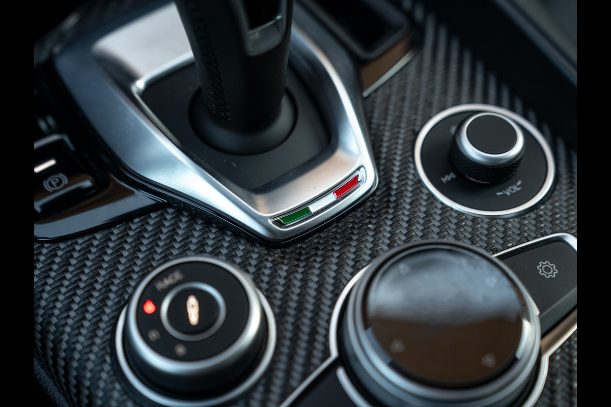 De echte kenner zal het laatste modeljaar van de Giulia Q met zijn of haar ogen dicht herkennen. Toch kunnen we het niet laten om kort de highlights te doorlopen. Met de nadruk op ‘lights’, want de herziende indeling van de koplampunits behoren toch wel tot de meest karakteristieke veranderingen. De 3 afzonderlijke LED-elementen per unit doen oude Alfa-tijden herleven, met de iconische 159 nog vers in ons geheugen. De donkere achtergrond van diezelfde koplampen zijn op hun beurt helemaal in lijn met de “smoked” achterlichten vanachter helder glas, alsmede de antracietkleurige Leggera-velgen, donkere Scudetto grille, dito spiegelkappen en vele carbon exterieurdetails. Onder andere de frontlip, side skirts en kofferklepspoiler zijn carbon-made. Het contrast met de geweldige Grigio Vesuvio lak is beeldschoon en weet iedereen te boeien. Wel óf geen autofanaat. Al denken we zeker te weten tot welke categorie de lezer behoort…