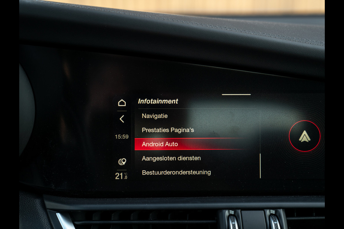 Echter, achterblijven op de moderne technologie, ho maar. Onze Alfa Romeo Giulia Quadrifoglio is van alle technische gemakken voorzien, plus een beetje meer dan dat. Het aanwezige Driver Assistance Pack onderschrijft dit als geen ander. Daarnaast hebben de Italianen gelukkig ruimte gelaten voor ‘ouderwetse’ spielerei, zoals een uitlaatgeluid dat door merg en been gaat. Het feit dat de sound van de 6-cilinder boven die van het (overigens geweldig klinkende) Harman Kardon audiosysteem wordt verheven, zegt toch genoeg? Een melodie gemaakt door 520 daverende paarden; die gaat u niet op Apple CarPlay terugvinden!
