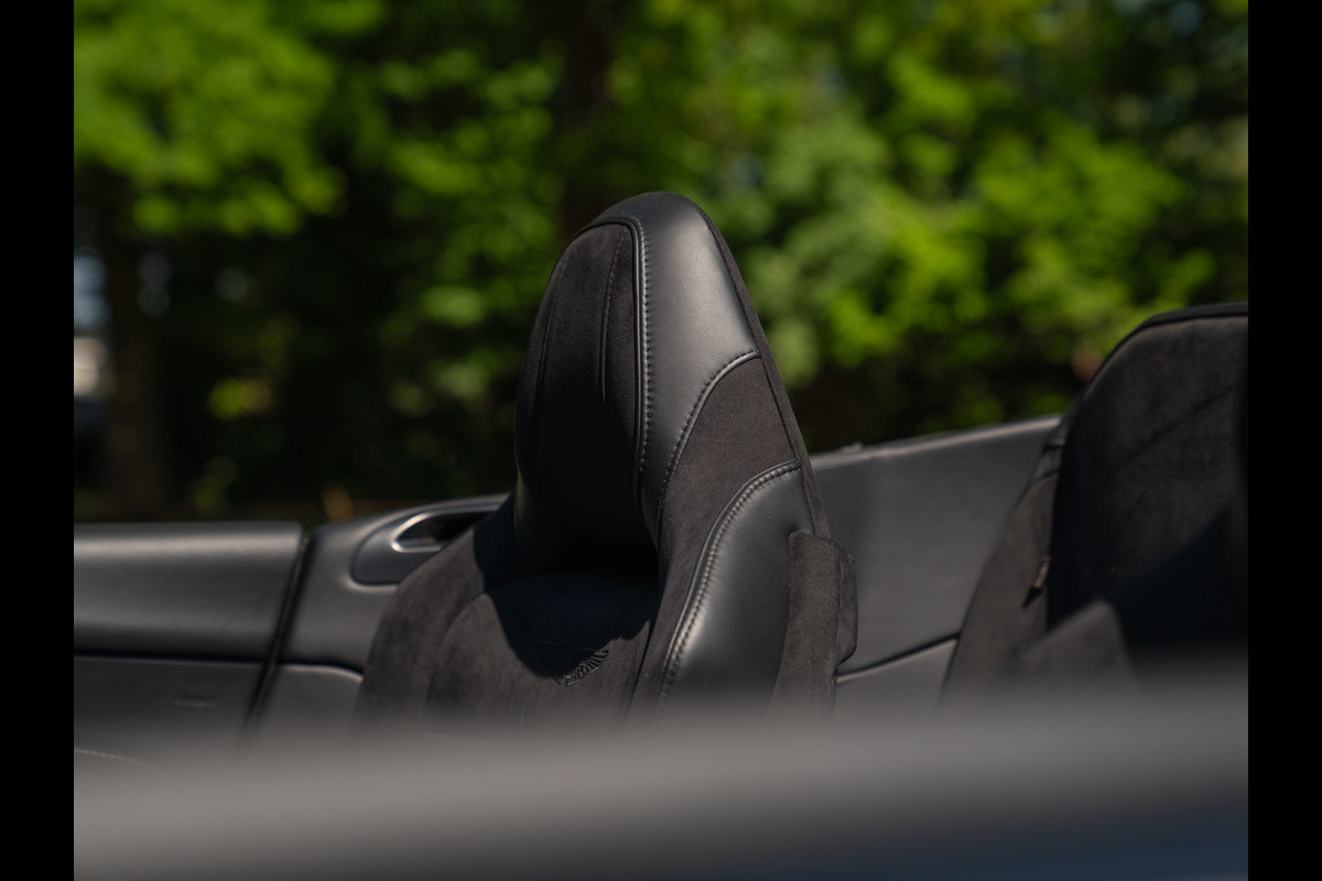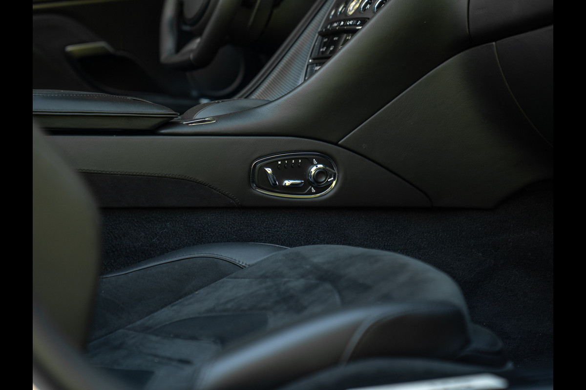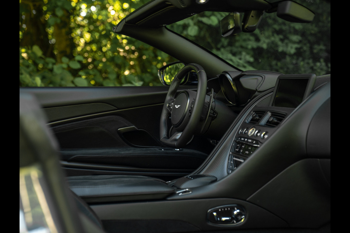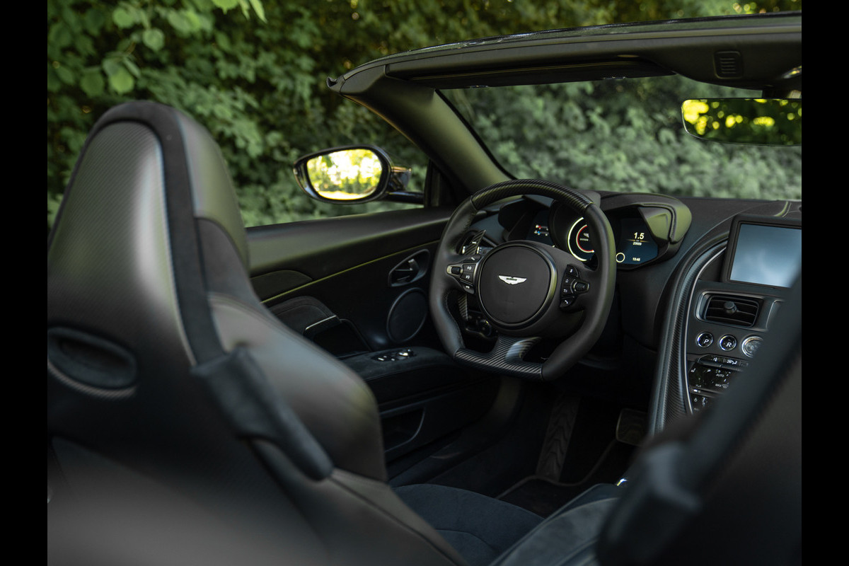 Treed binnen en meteen wordt duidelijk dat het koolstofvezel feestje op indrukwekkende wijze wordt voortgezet. Naast het carbon sportstuur en dito schakelpaddles, is ook een Carbon Fibre Twill trim op de optielijst aangevinkt. Deze delen hebben een zijdeglans afwerking, zodat de hardcore machine een luxueuze touch krijgt. Plaatsnemen doet u in elektrisch verstelbare én verwarmbare Sports Plus Seats, inclusief de befaamde Aston Martin Wings geïntegreerd in de hoofdsteunen. De meesterlijk zittende sportstoelen hebben een Obsidian Black lederen afwerking gecombineerd met Pure Black Alcantara delen, net als de rest van de cockpit. De fascinatie en mysterie zijn compleet dankzij de toevoeging van een Dark Chrome Jewelry Pack. Erg gevat, want een juweel op wielen is de Aston Martin DBS Superleggera Volante zeer zeker.