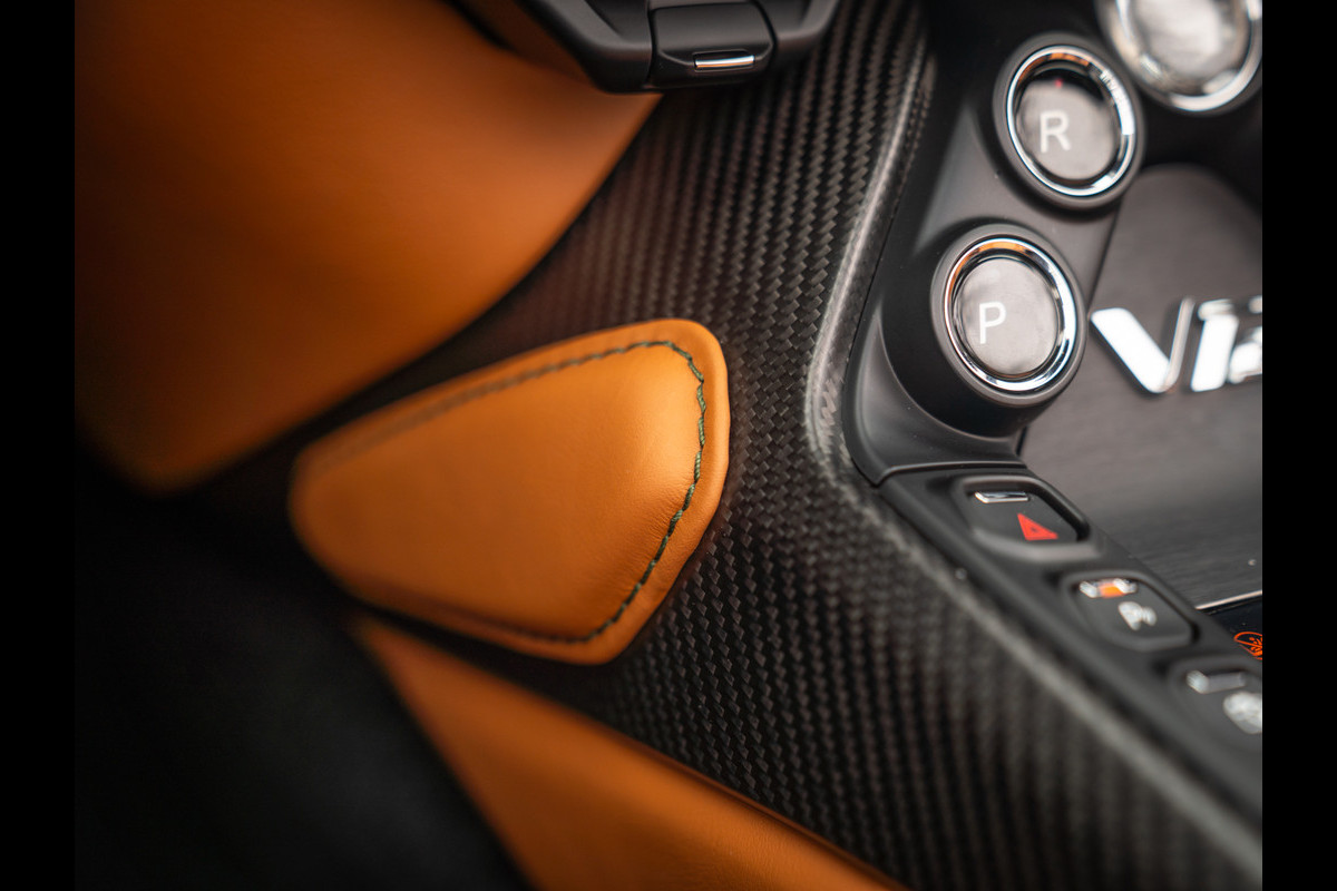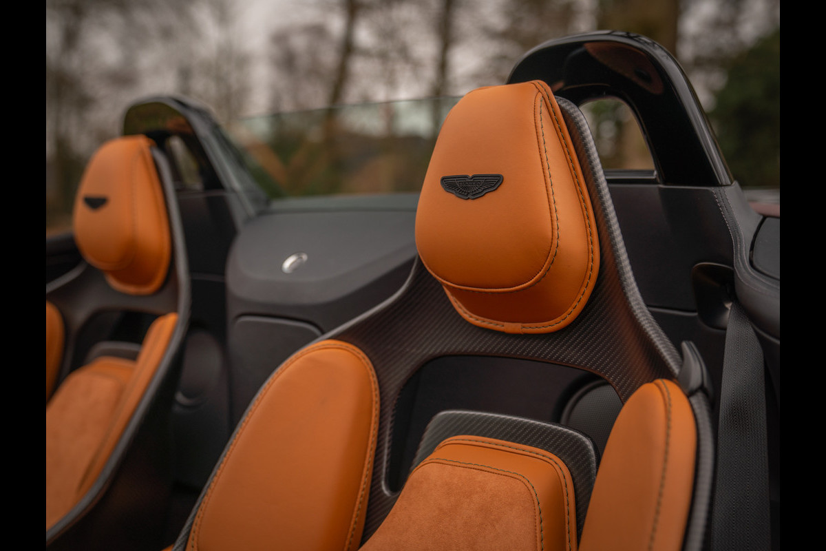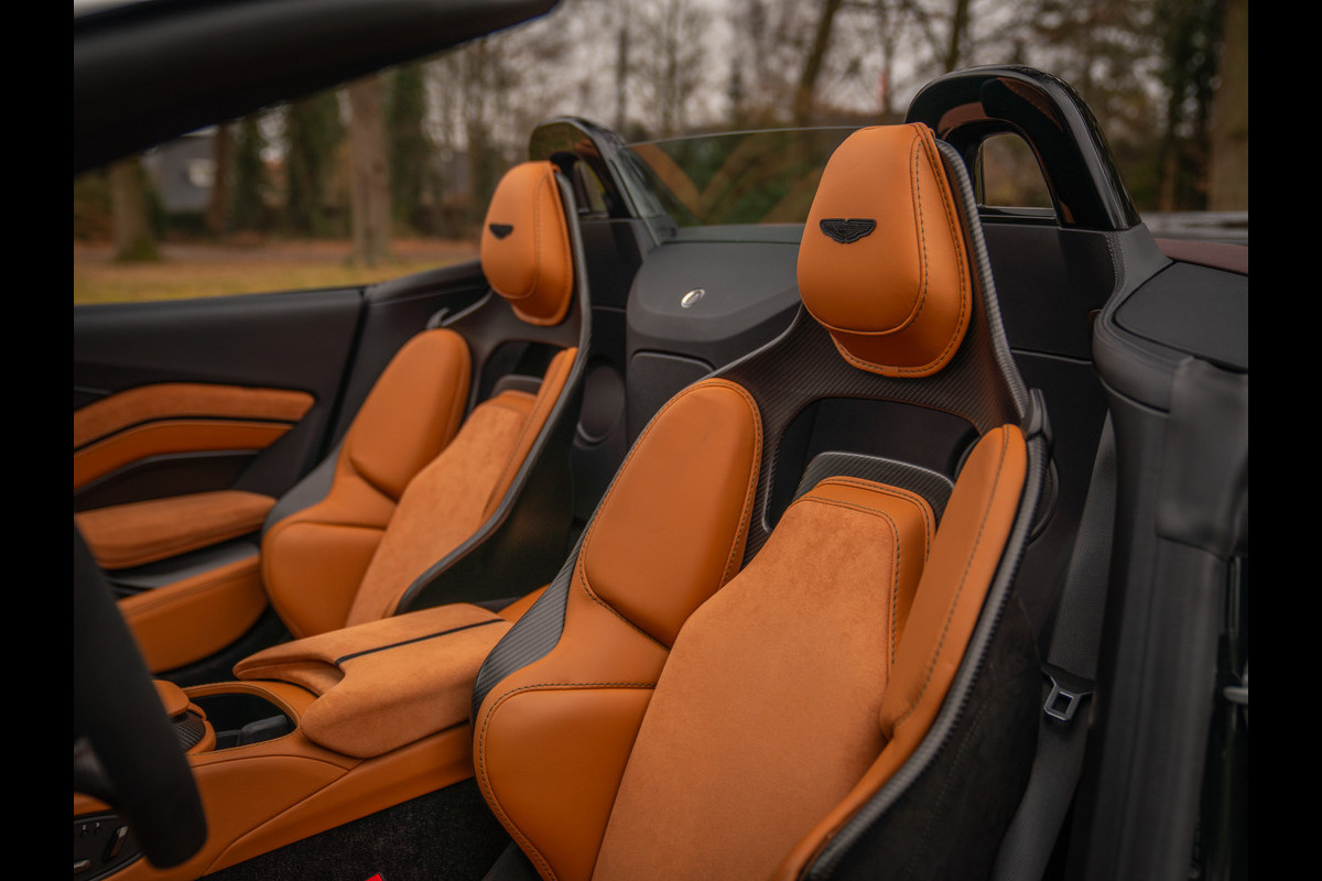 Gelukkig voor de toekomstig inzittenden is de “cockpit view” al net zo indrukwekkend: vanuit de carbon sportstoelen, die uw lichaam perfect omsluiten – en dat is hard nodig ook – heeft u zicht op een two-tone dashboard, afgewerkt met Obsidian Black en Oxford Tan lederen bekleding. Een super smaakvolle samenstelling, die één-op-één is gekopieerd naar de finish van de lichtgewicht kuipen, met als belangrijkste verschil dat de middendelen op de stoelen – net als de portieren, zijn bekleed met alcantara. Briljant mooi! Ook het achterdek en de middenarmsteun zijn Oxford Tan Alcantara uitgevoerd, terwijl de dakhemel en het stuurwiel Obsidian Black kleuren. De boven- en onderzijde van het sportstuur bevatten op hun beurt dezelfde carbon inserts als het instrumentarium, de ventilatieroosters en midden-/tunnelconsole, als onderdeel van het carbon interieurpakket. Over pakketten gesproken: Jewellery Pack Dark Chrome zorgt voor de ultieme finishing touch aan boord van de Aston Martin V12 Vantage Roadster. Of zouden dat toch de Pinewood Green stiksels zijn?