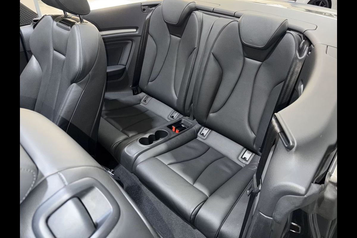 Uniek fraaie Audi A3 Cabriolet 40 Tfsi S-LINE Quattro van 04-2018 met slechts 68.843km. gereden in het Daytona Grau Pareleffect met een Antraciet "Milano" Vol-Leder S-LINE Interieur (Sportstoelen) die naast de toch al rijke standaard uitrusting o.a. is voorzien van: Opberg- en bagageruimtepakket, Akoestische softtop, Audi Virtual Cockpit plus, Uitrustingspakketten: S line Selection & Technology Selection, Elektrisch verstelbare - verwarmde en inklapbare buitenspiegels, Bluetooth handsfree systeem met spraakherkenning (Audi Phone Box), Parkeerhulp voor en achter, akoestisch en visueel met selectieve weergave (APS Plus) & achteruitrij-camera, Rijstrookwissel-assistent (Side Assist), Sportonderstel met demperregeling (Magnetic Ride), Interieurafwerking: Geborsteld mat aluminium inleg, Ambiente verlichting, Automatisch dimmende binnenspiegel, Automatische klimaatregeling met 2 zones, Nekverwarming, Elektrisch verstelbare lendensteun voor de voorstoelen, Multifunctioneel lederen 3-spaaks sportstuur - afgeplat van onderen met Schakelpaddles, Verlichtingspakket, 19-inch L.M. Velgen - 5-spaaks in V-design - mat titaniumlook - "Audi Exclusive / Audi Sport", Matrix LED-koplampen, MMI Navigation Plus met MMI Touch, Verwarmde voorstoelen, DSP-geluidssysteem / Audi-geluidssysteem, Winddeflector, etc, etc.....