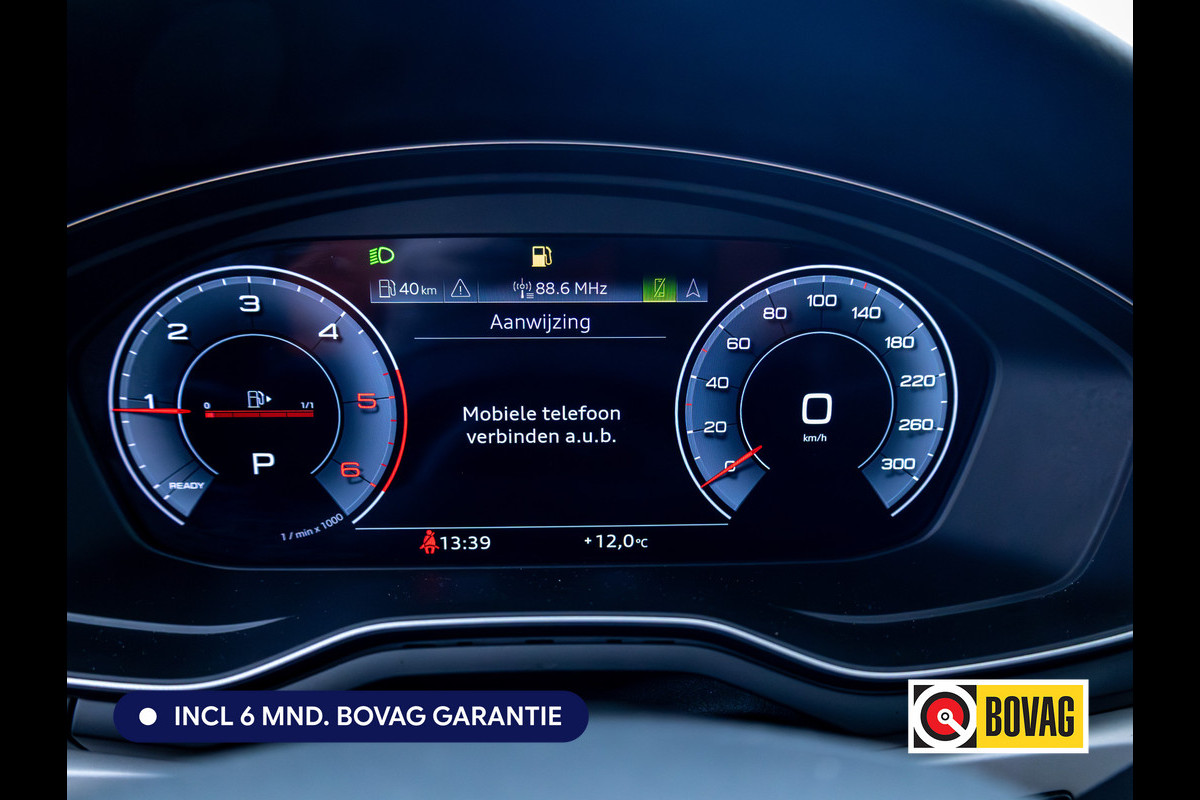 Een gevisualiseerd overzicht van alle belangrijke functies wordt geleverd door het digitale dashboard. Met een gerust hart achteruitrijden? Dat kan, dankzij de achteruitrijcamera. Adaptive cruise control is een comfortabele en veilige optie. Het systeem reguleert de snelheid en houdt automatisch afstand tot uw voorligger. Kop aan kont langzaam rijden: dan is afstand houden soms lastig. De file assistent helpt en zorgt automatisch voor veilige ruimte tot de voorligger. Ook als die tot stilstand komt. Deze auto gaat met u in gesprek. Hij vertelt u dankzij remote services alles over de status van diverse onderdelen en laat zich desgevraagd ook activeren. Gewoon via uw smartphone. De uitrusting van deze Audi is met full map navigatiesysteem, electronic climate control, schakelpaddles aan het stuur, DAB ontvangst, automatisch dimmende buitenspiegels en centrale deurvergrendeling met afstandsbediening behoorlijk compleet.