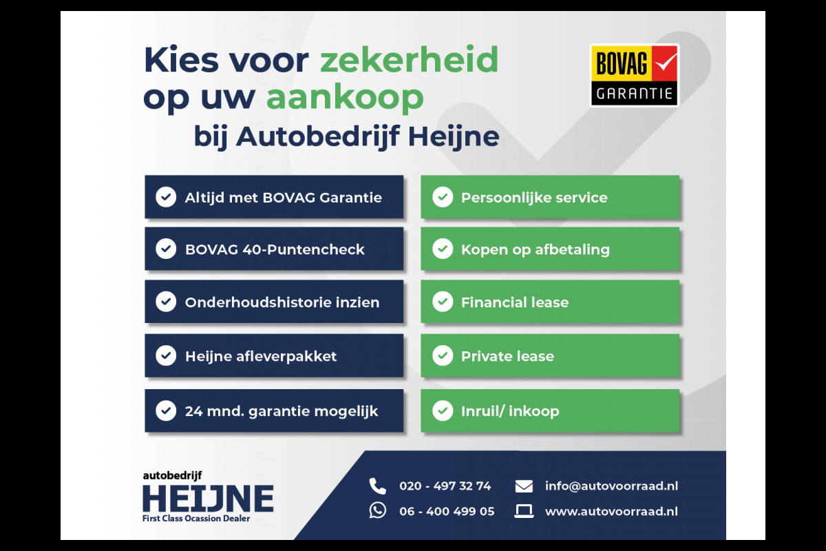 Autobedrijf Heijne is een BOVAG occasion dealer met een topselectie jong gebruikte auto`s deze zijn: 100% onderhouden met duidelijke historie, gegarandeerde kilometerstanden, BOVAG garantie en altijd scherp geprijsd. Uw huidige auto ruilen wij graag in! Ook zijn wij gespecialiseerd in het financieren van u nieuwe aankoop dit zowel voor de particuliere klant of Financial-lease voor de (startende) ondernemer en zzp’er. Dit tegen de meest gunstige voorwaardes en laagste rente tarieven. Optioneel kunt u kiezen voor het Heijne Afleverpakket €695-. En ook na aankoop kunnen wij u van dienst blijven zijn in onze eigen werkplaats. Bekijk onze voorraad jong gebruikte auto`s op de website van Autobedrijf Heijne op www.autovoorraad.nl of kom langs voor een bezichtiging in onze showroom in Zwanenburg. Tel 020-4973274 WhatsApp: 0640049905 Mail: info@autovoorraad.nl