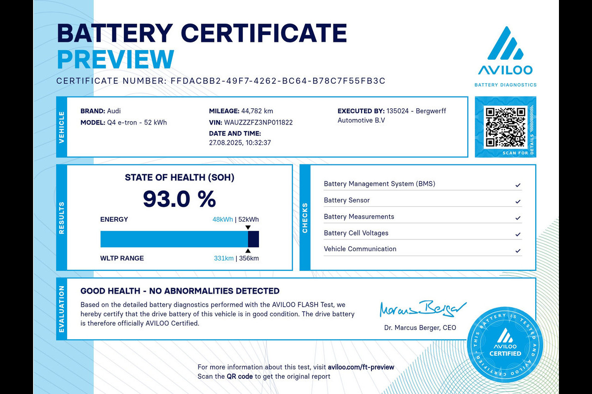 Dit exemplaar is daarbij ook nog voorzien van alle wenselijke opties zoals een warmtepomp, Panorama dak en lederen bekleding. De batterij beschikt over een State of Health van 93 procent en gaat u dus ook de komende jaren moeiteloos brengen naar uw plek van bestemming. Moet u dan bijladen dan gaat dat tot 110 kW per uur en met zijn lage gewicht van slechts 1.870 kilo is de Q4 niet alleen een zeer fraaie maar tevens verstandige keuze.