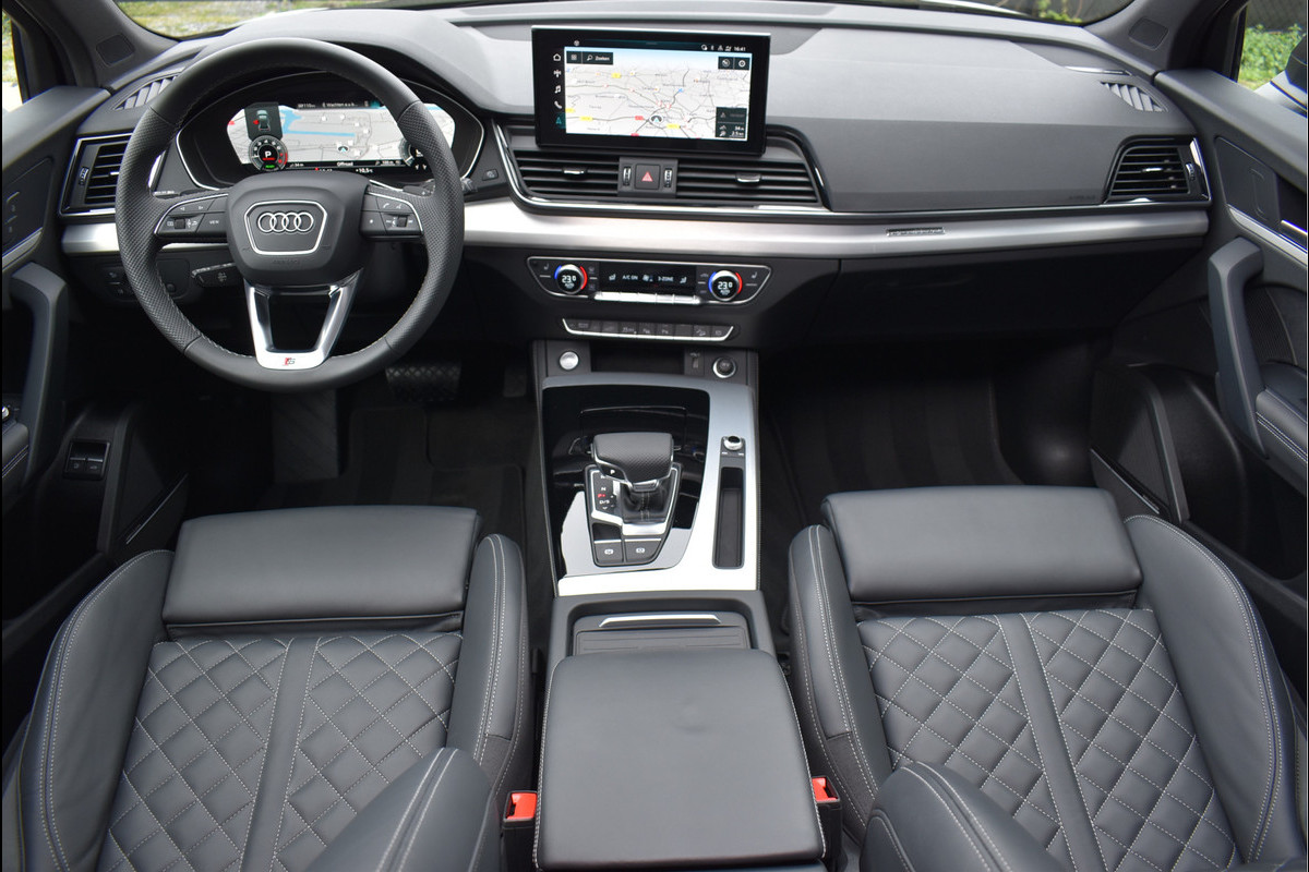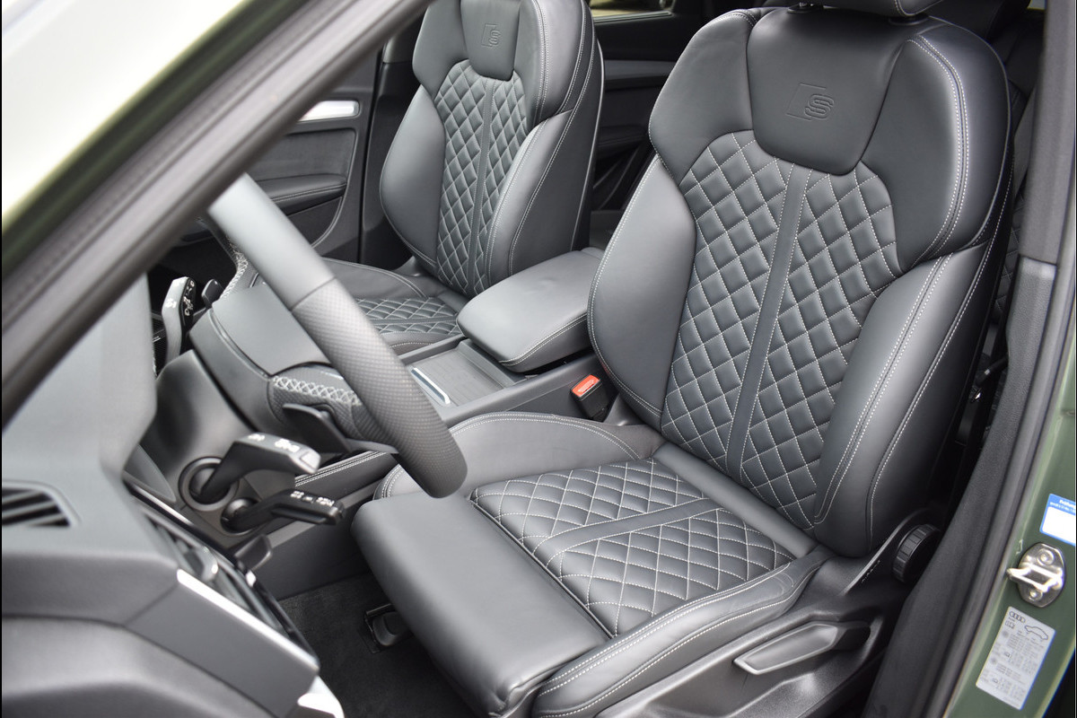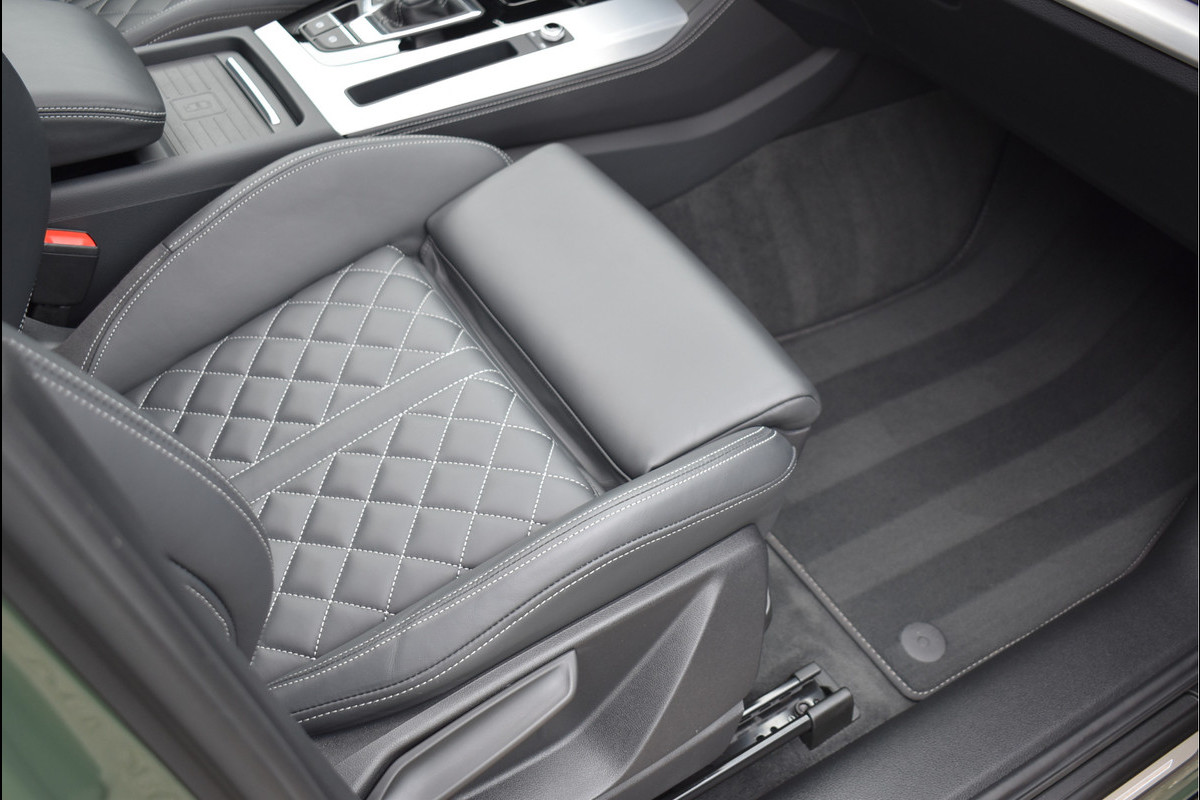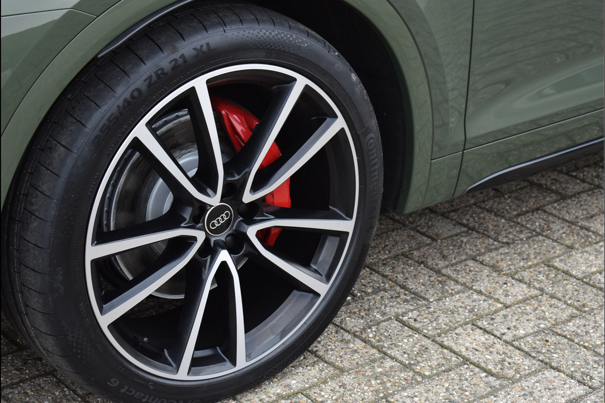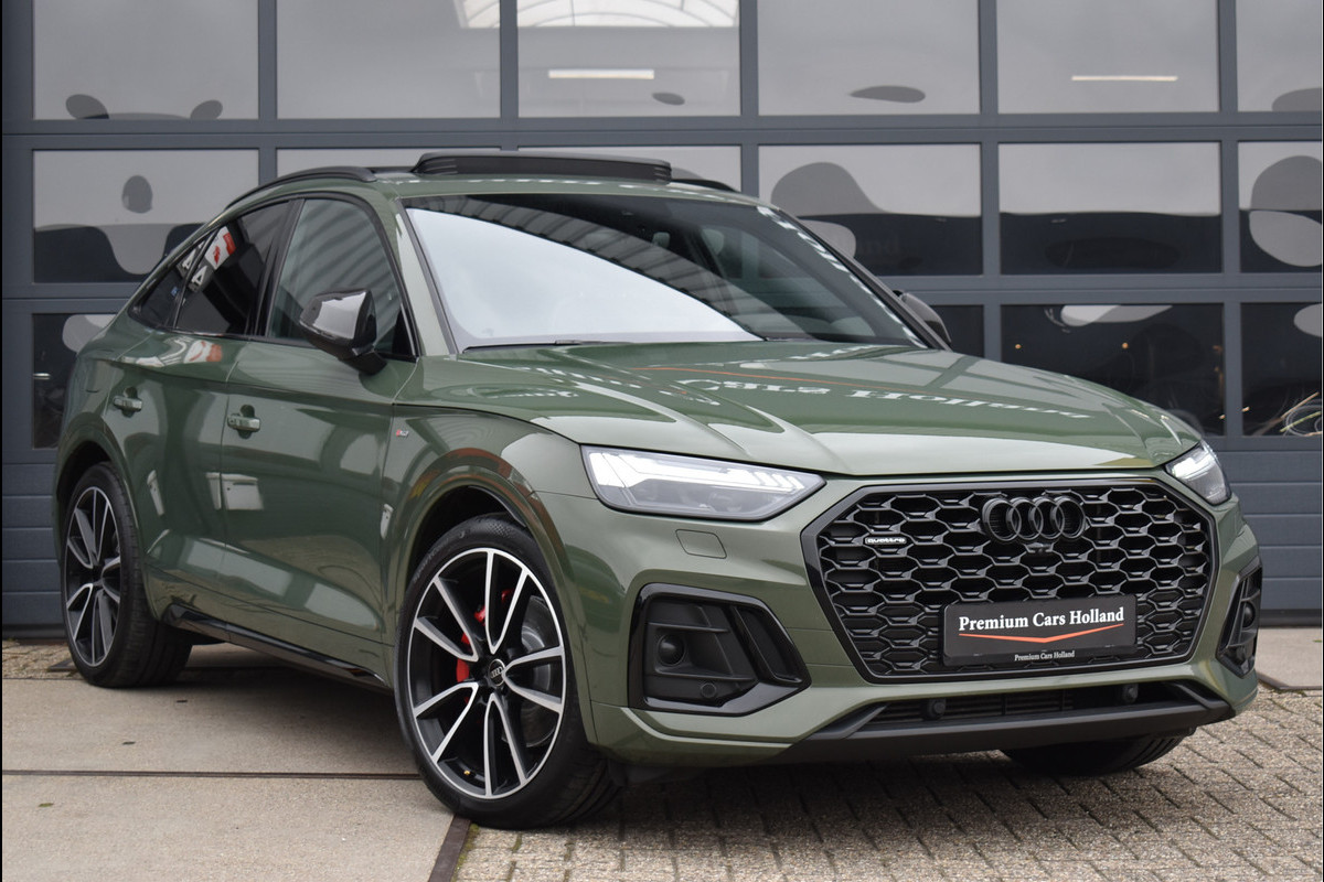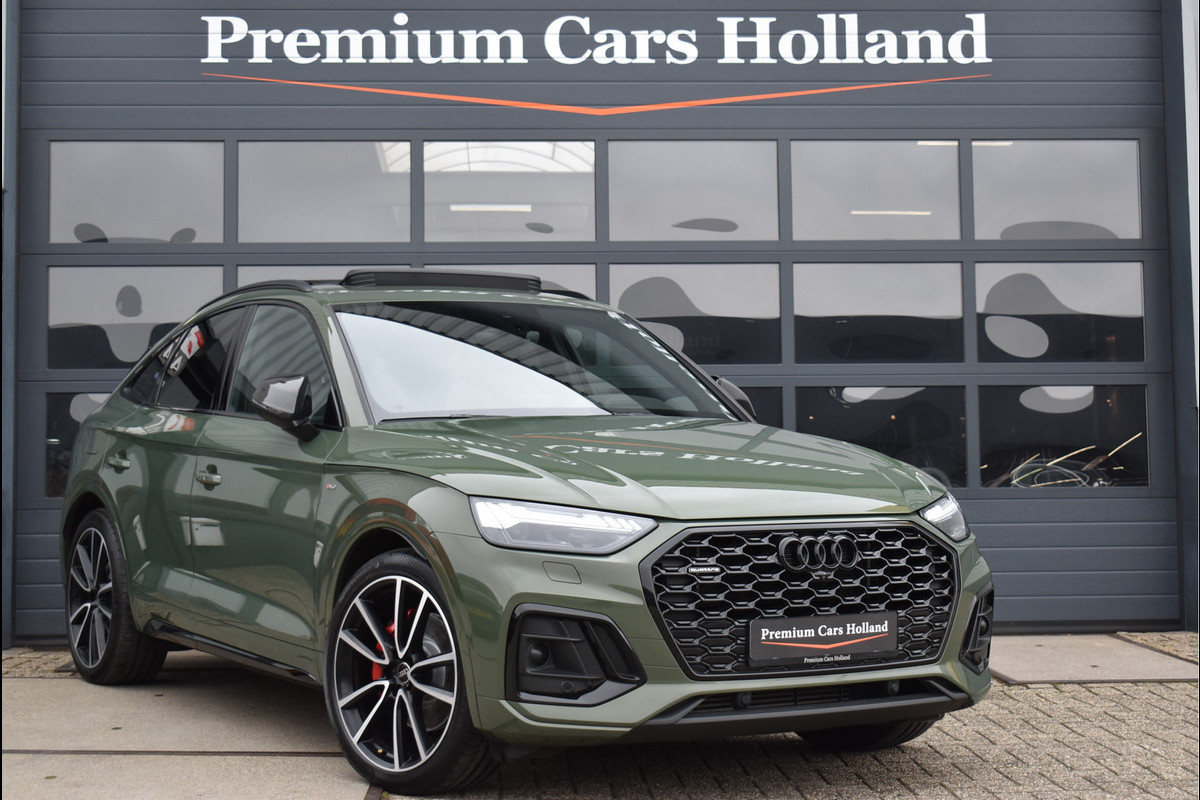 2022 Audi Q5 Sportback 55 Tfsi e S-Line 367 Pk Black Edition DLR Onderhouden District Groen Metallic met 95076 Km Opties: Matrix Koplampen Black Optik Pakket Getint Glas RS Sportstoelen Leder Vienna S-Line Int/Ext Pakket Digitale Cockpit Navigatie Full Map Keyless Entry/Start Carbon Spiegels Bang&Olufsen Soundsysteem Spiegels Elektrisch Inklapbaar Climate Control 3 Zone Stoelverwarming Drive Select Instelbaar Parkeersensoren V+A Luchtvering met Automatische Niveau Regeling Cruise Control DAB Radio 360 Camera Apple Carplay/Android Achteruitrijcamera Standkachel Oled Achterlichten (zandlopers) SQ5 Diffusor Geïsoleerd Glas 21 Inch Velgen