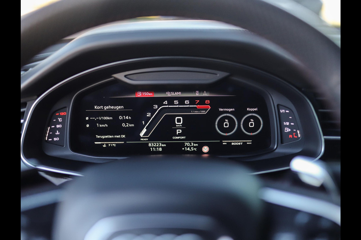 Zoals u mag verwachten van deze Audi RS Q8 is hij uitgerust met een reeks aan actieve veiligheidssystemen. De camera van de verkeersborddetectie herkent verschillende soorten verkeersborden en toont deze op het dashboard. Onbedoeld buiten de rijstrook raken wordt voorkomen door het Lane-keeping systeem. Onbedoeld bumperkleven is er niet bij, dankzij de forward collision warning. Die waarschuwt direct als een botsrisico met uw voorligger dreigt. Ook helpen het head-up display, dodehoekdetectie, hill hold functie, frontale botsbescherming en bandenspanningcontrolesysteem, uw rit tot een veilige rit te maken.