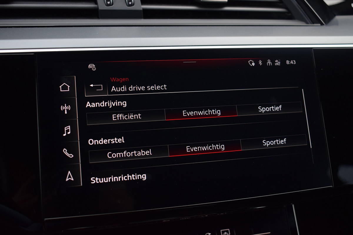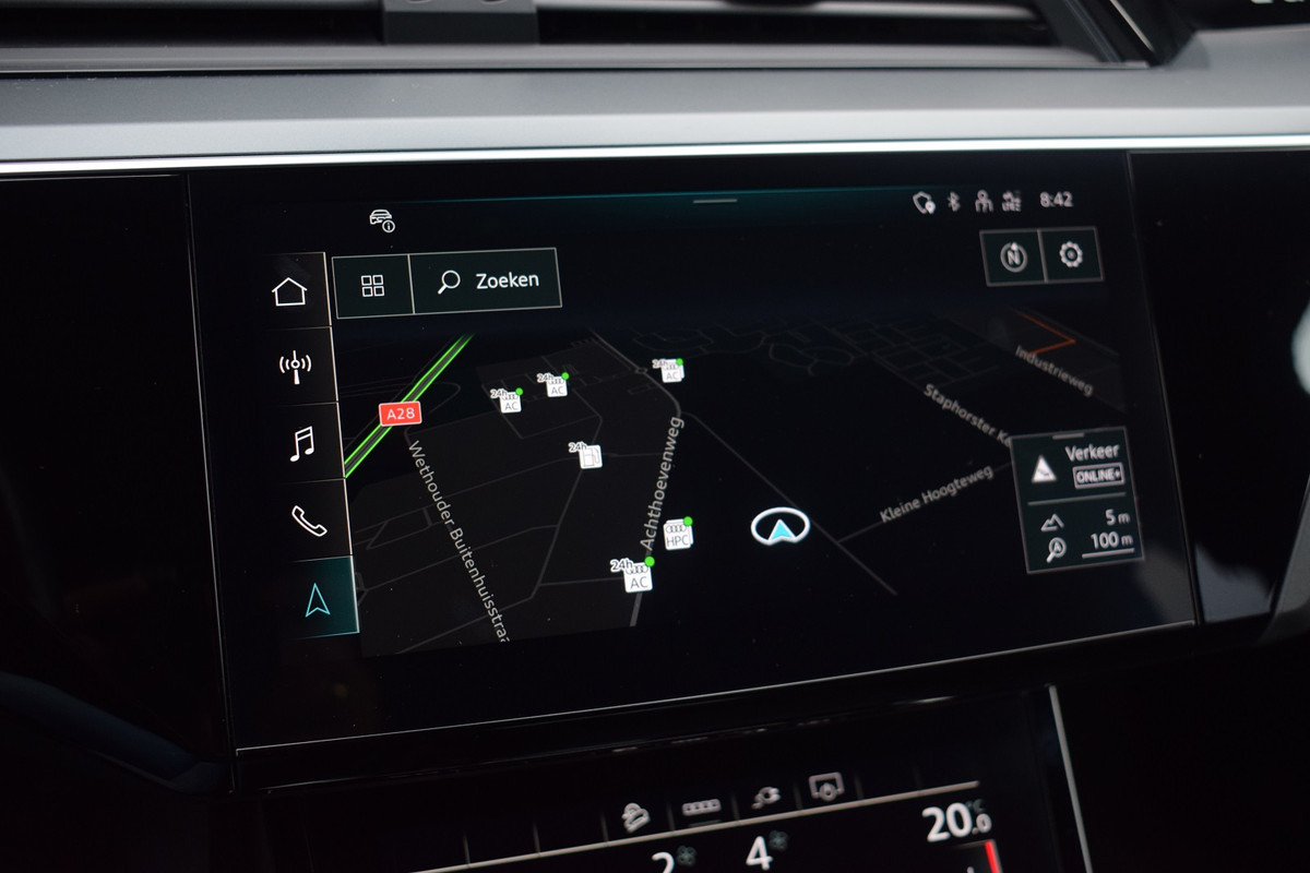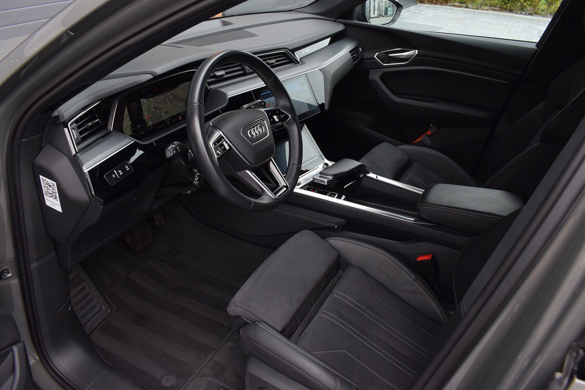 Origineel Nederlands geleverde Audi Q8 e-tron 55 met 115kWh accu. Auto is dealer onderhouden en afkomstig van eerste eigenaar. Uitgevoerd met o.a.: Oplaadcontact links + rechts, Panoramadak, Luchtvering, Lichtmetalen velgen 22", Achteruitrijcamera, Keyless entry, Half lederen / alcantara interieur met sportstoelen voor, Elektrisch verstelbare voorstoelen met geheugenfunctie in bestuurdersstoel, Lederen multifunctioneel sportstuur, Climate control (voor en achter gescheiden regelbaar), Adaptieve Cruise control, Lane Assist, File ondersteuning, Navigatiesysteem High, Stoelverwarming voor + achter, Alarm klasse III, Buitenspiegels elektrisch verwarm- en inklapbaar, Privacy glas achter, Elektrisch bedienbare achterklep.