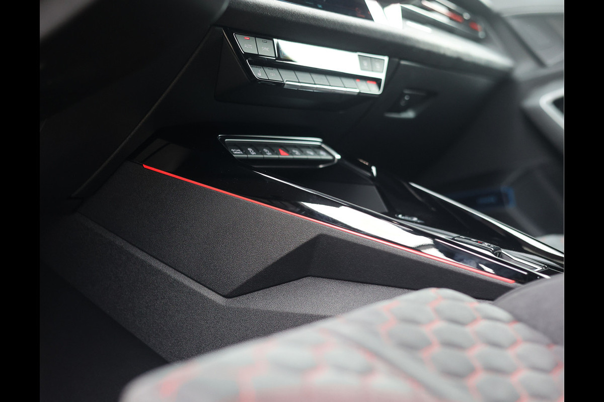 Het exterieur valt direct op door de RS-specifieke details in hoogglans zwart, de carbon dakspoiler, het RS-sportuitlaatsysteem en de 19-inch 10-kruis-spaakvelgen in zijde-mat grijs. Samen geven deze elementen de RS3 een scherp, atletisch profiel dat opvalt in elk straatbeeld. Het panoramadak van glas voegt een gevoel van ruimte en licht toe aan het geheel, terwijl de Matrix LED-koplampen met dynamische animatie voor een hightech uitstraling zorgen.