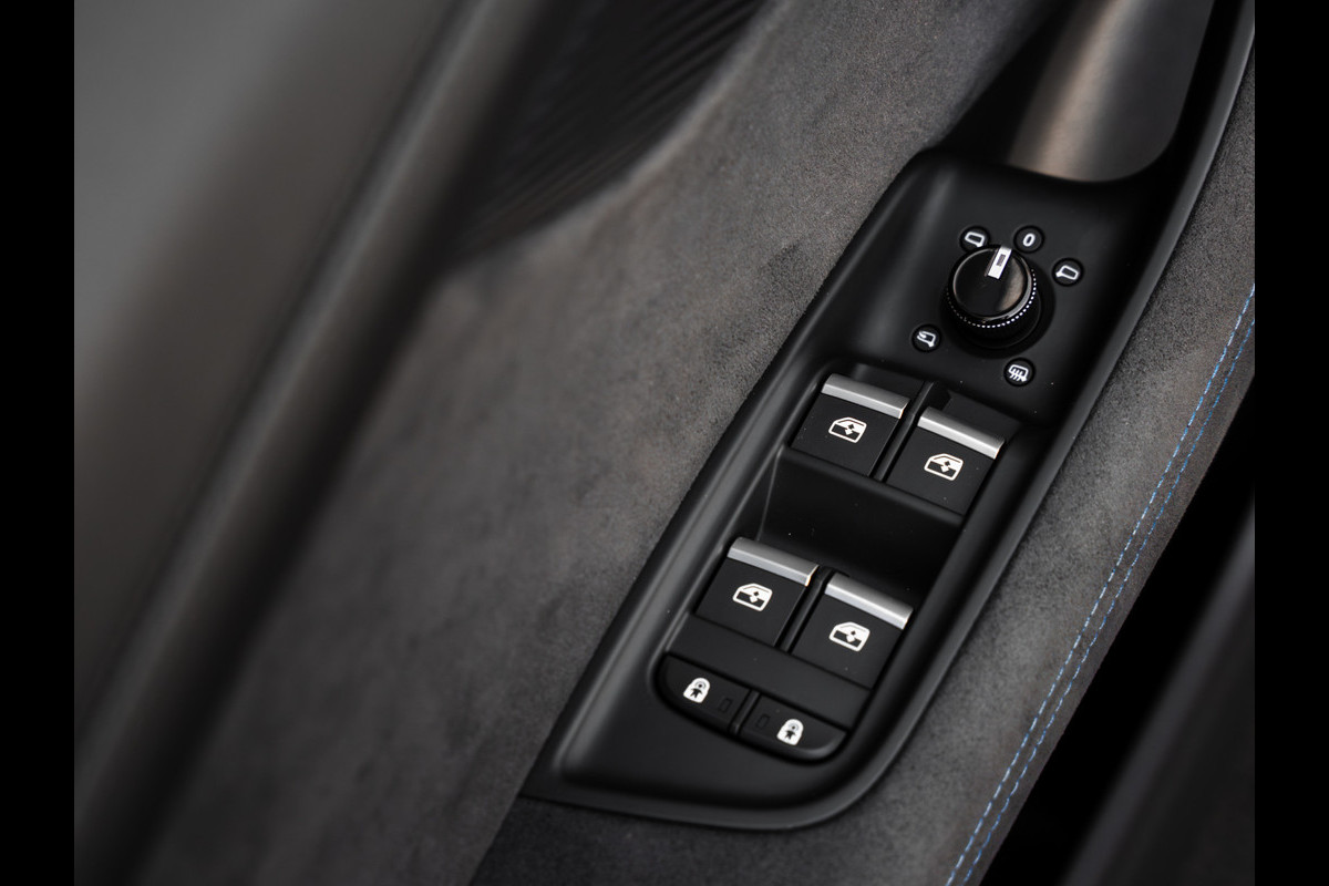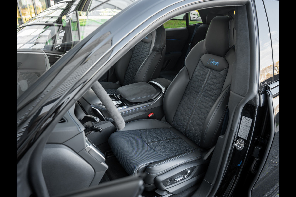 Een bomvolle Audi RSQ8 Performace uit Mei 2025. Deze RSQ8 is uitgevoerd in de kleur Mythoszwart metallic en heeft RS-sportstoelen vóór in zwart leder Valcona geperforeerd met honingraat en afgewerkt met een prachtig blauw stiksel.