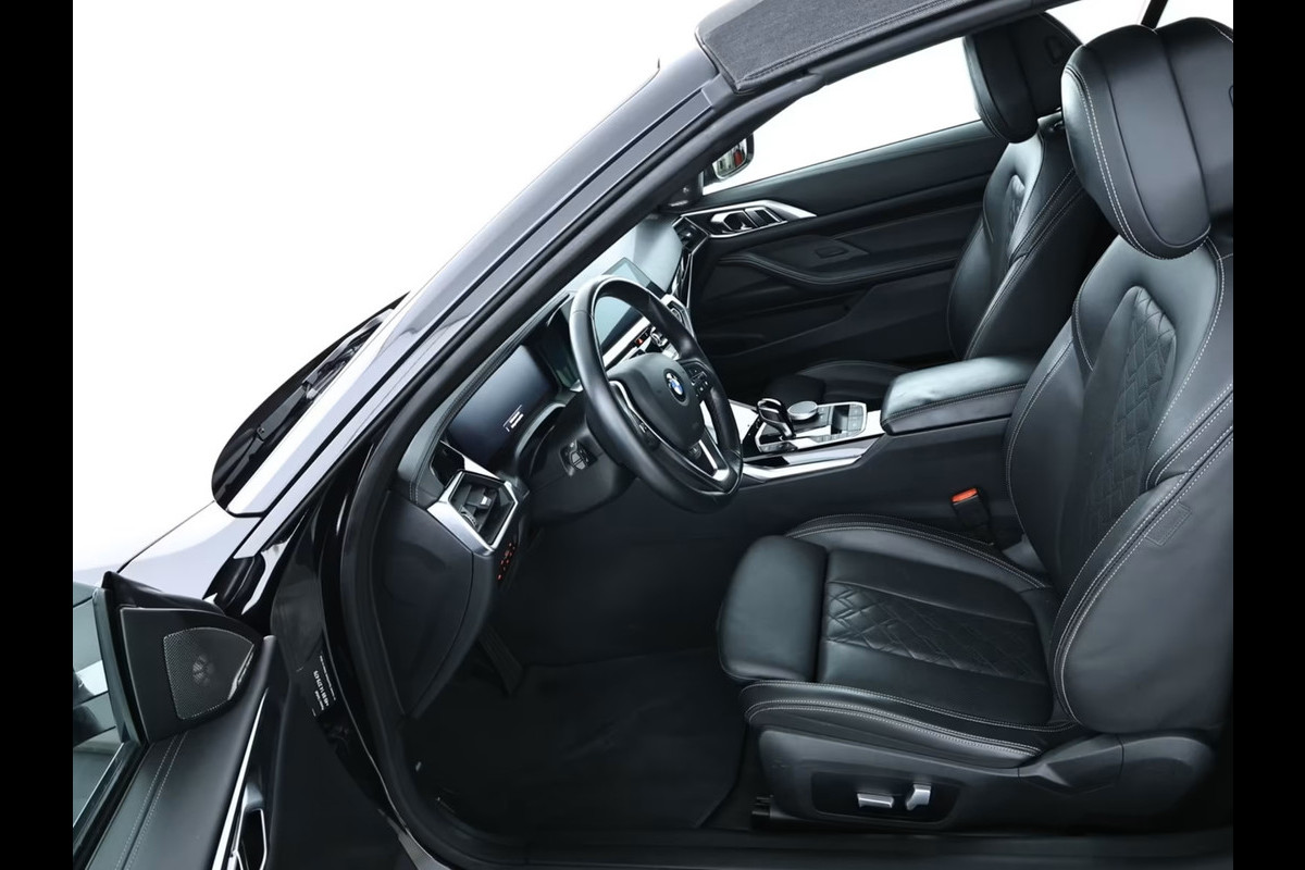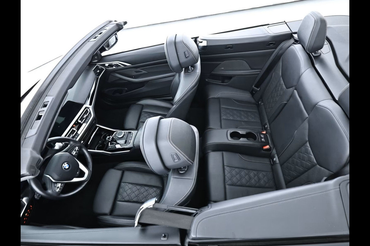 Super Fraaie BMW 430iA Cabriolet van de 11e maand 2021 met origineel 23.230km. gereden (1e Eig - Unfallfrei - Vol. BMW Onderh) in het Saphire Schwarz Metallic met een "BMW Individual" Schwarz (Grijze Stiksels) Vol-Leder Interieur (Sportstoelen) die o.a. is voorzien van: Actieve ventilatie voor de voorstoelen, Nekverwarming, Driving Assistent, Head-up display, Keyless / Comforttoegang (open- en sluitsysteem), Verwarmd Multifunctioneel lederen Sportstuur, 18-inch L.M. Velgen in V-Spaak "780" in Orbit Grau, Parkeer-assistent incl. Achteruitrijcamera, Harman & Kardon Soundsysteem, Sportonderstel (M-Technic), Deactivering passagiersairbag, Airbags bestuurder/passagier, Elektrisch verstelbare - verwarmde & inklapbare buitenspiegels, Uitrustingspakket: Connected Professional, BMW Live Cockpit Professional (navigatie), DAB-tuner (digitale radio-ontvangst), Doorlaadsysteem (middenarmsteun achter), Dynamische tractiecontrole (DTC), Attention Assist, Handsfree systeem met USB-interface, Cruise Control met remfunctie, Bekerhouders voor en achter, Automatische transmissie Steptronic-8, LED-achterlichten, Automatisch dimmende binnenspiegel, Isofix-bevestigingspunten voor kinderzitjes achterin, Automatische klimaatregeling met 3 zones en automatische luchtcirculatie, Knie-airbag bestuurder, Hoofdairbag-systeem voor & achter, Licht- en regensensor, LED-koplampen, Servicesysteem: ConnectedDrive Services / Intelligent Emergency Call incl. TeleServices, Elektrisch verstelbare & verwarmde voorstoelen (bestuurdersstoel met geheugenfunctie), Sensatec dashboard, etc, etc.....