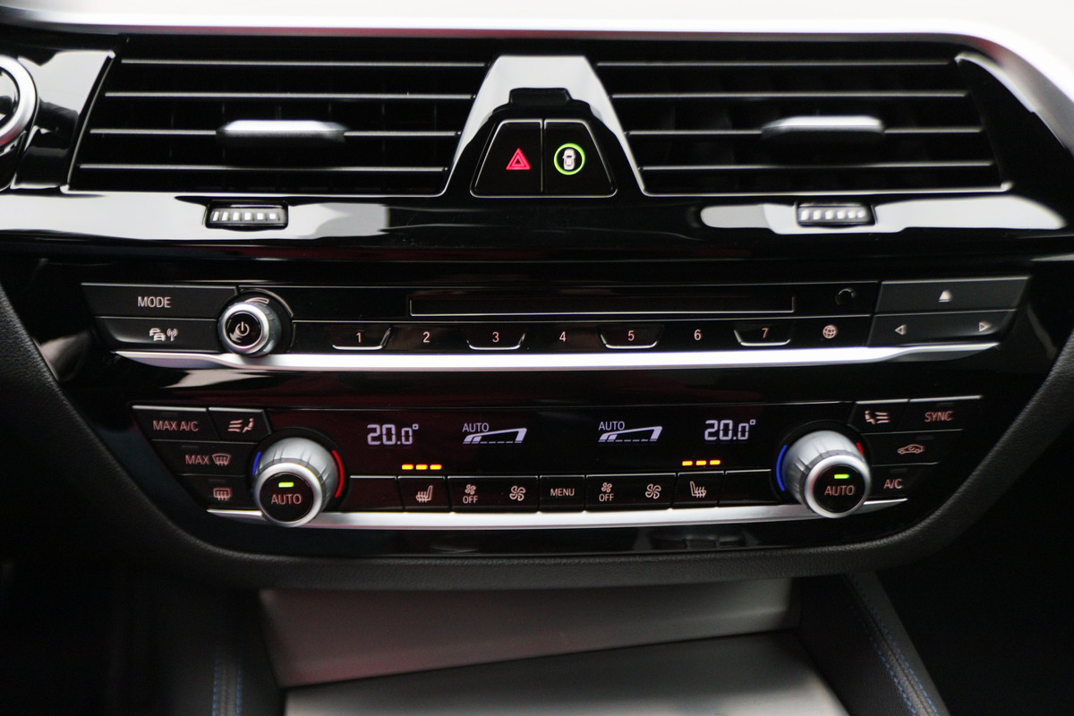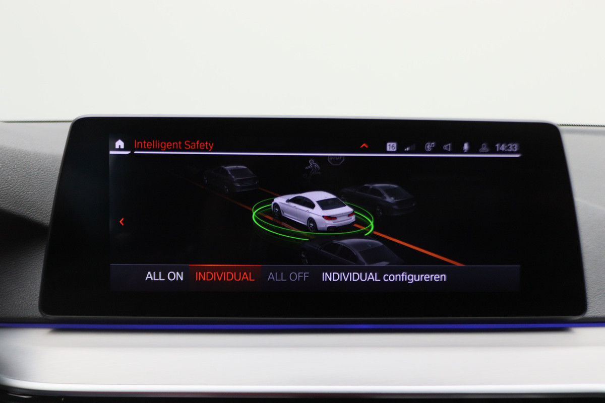 Zoals u mag verwachten van deze BMW 5-serie is hij uitgerust met een reeks aan actieve veiligheidssystemen. Dat de auto steeds meer taken van de bestuurder overneemt, merkt u bijvoorbeeld aan het systeem voor verkeersbord-detectie in deze auto. Het Lane-keeping systeem zorgt dat u mooi binnen de lijntjes blijft. Ongemerkt buiten de rijstrook komen is er niet meer bij. Deze auto heeft actieve dodehoekdetectie. Dit veiligheidssysteem helpt u om aanrijdingen te voorkomen. U bent mede dankzij head-up display, forward collision warning system, hill hold functie, brake assist en bandenspanningcontrolesysteem steeds veilig onderweg.