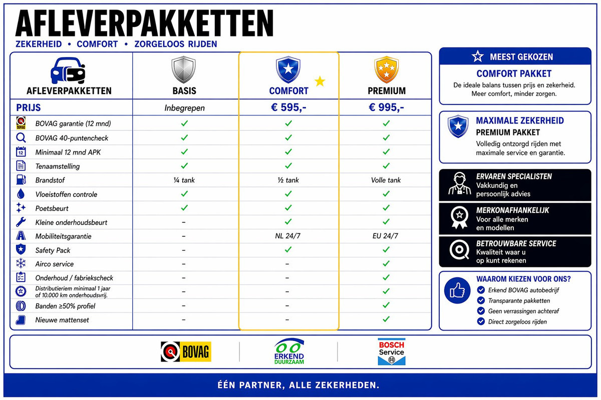 Dit afleverpakket bevat: BOVAG 40-Puntencheck; Nieuwe APK - Combi Comfort Pakket (€ 595):
