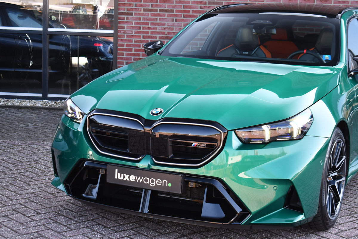 Smetteloze M5 Touring, afkomstig van BMW AG. Veel opties: panoramadak, Driving assistent profesional, M-Driverspack, 2x TV schermen achterin, Comfort-pack, alcantara hemelbekleding, carbon spiegelkappen, stoelverkoeling, stuurverwarming, achterbankverwarming, Bowers & Wilkens, etc. Reeds voorzien van klasse 4 alarmsysteem.