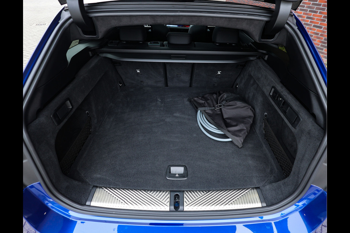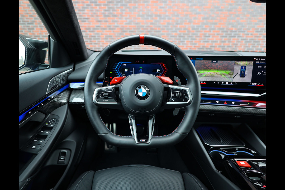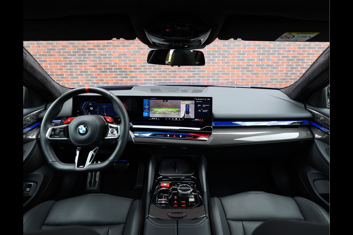De uitvoering die u hier ziet, is zonder twijfel een van de meest complete M5 Touring's die leverbaar zijn. Het exterieur schittert in Marina Bay Blue metallic, aangevuld met Iconic Glow verlichting, M Carbon spiegelkappen en Shadow Line details. Achter de wielen schuilen de M Carbon keramische remmen, die de enorme prestaties feilloos weten te beteugelen. Het geheel oogt niet alleen krachtig, maar straalt ook exclusiviteit uit.