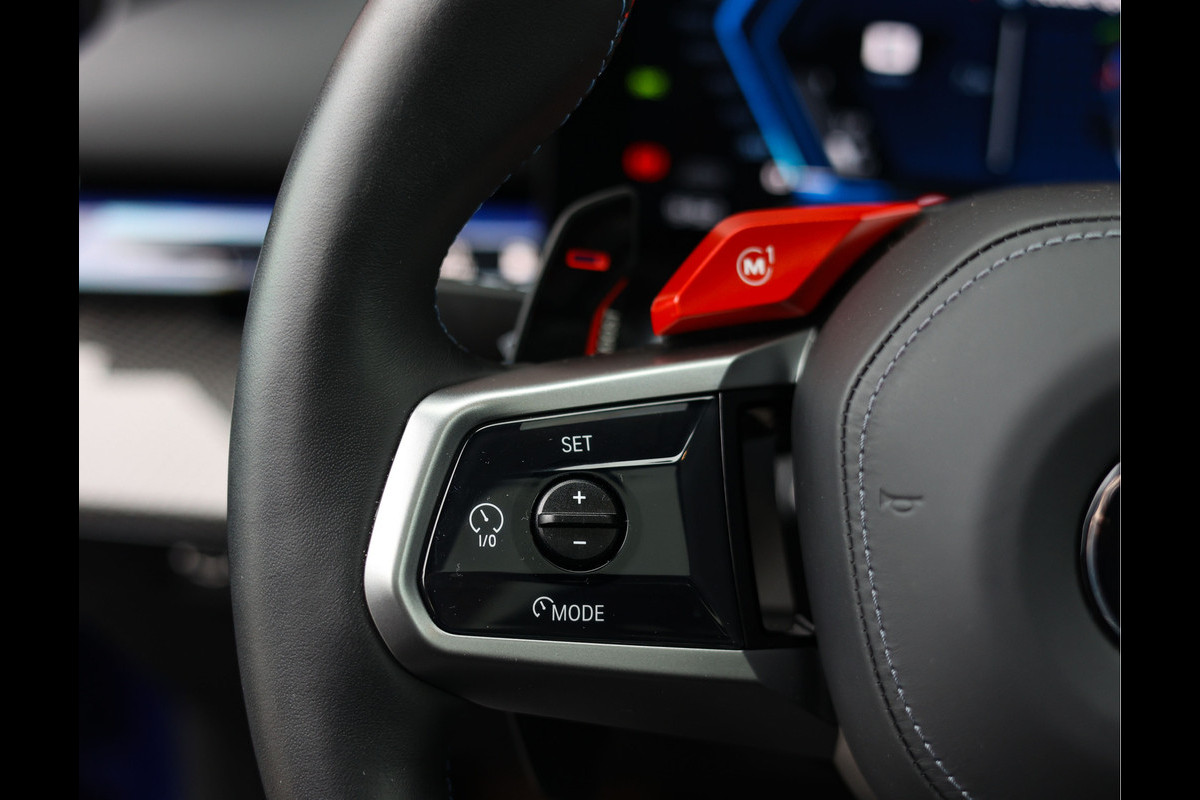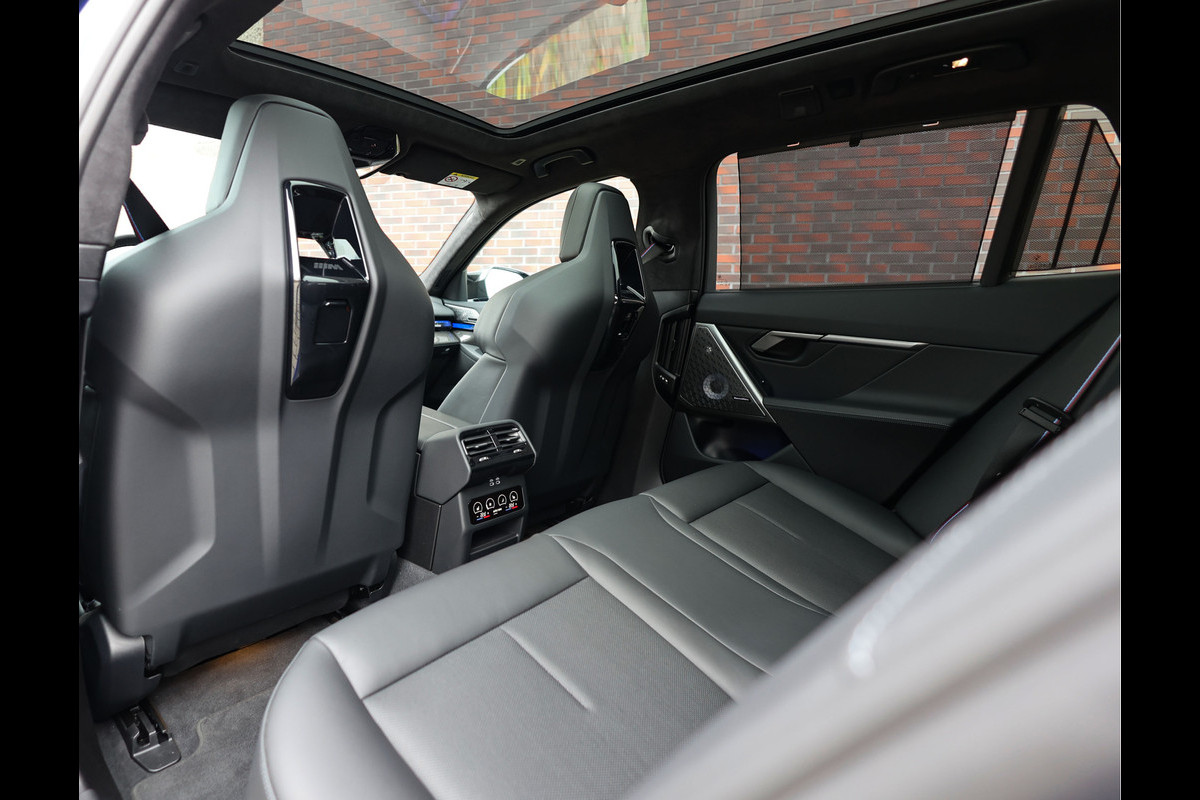 Binnenin heerst een sfeer van verfijning en innovatie. M multifunctionele stoelen in zwart Merino-leer bieden zowel steun als comfort, met ventilatie en verwarming voor elk seizoen. Het interieur wordt verlicht door de sfeerverlichting en benadrukt door de carbon interieurlijsten met zilverdraad. Het Bowers & Wilkins Surround Sound System vult de cabine met kristalhelder geluid, terwijl de interieurcamera, het BMW Live Cockpit Professional en de persoonlijke eSIM de nieuwste technologie tastbaar maken.