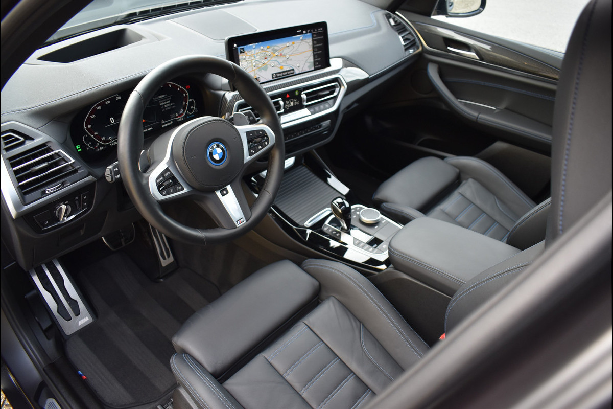 Model 2022 BMW X3 xDrive30e M-Sport Pakket 292 Pk 11-2021 met 79899 km DLR Onderhouden Frozen Black Matt Metallic (origineel) Unieke Auto Opties: Laser Led Koplampen M-Sportpakket M-Sportstoelen Vol Leder met Memory (blauw stiksel) Shadow Line Exterieur Elektrische Stoelen Verwarmd Stuurwiel Stoelverwarming V+A Digitale Cockpit Groot Lederen Deurpanelen/Dashboard Navigatie Groot Stoelverwarming Zwarte Hemel Bluetooth Telefoon Draadloos Apple Carplay Carbon Int Pakket Dubbel Glas Climate Control 3 Zone Lederen Airbag Cruise Control 360 Camera Getint Glas Dodehoek Detectie Carbon Spiegels DAB Radio Ontvanger Comfort Acces (keyless) Sfeerverlichting in Kleur Instelbaar Elektrische Achterklep Head-Up Display Parkeersensoren V+A 20 Inch Velgen