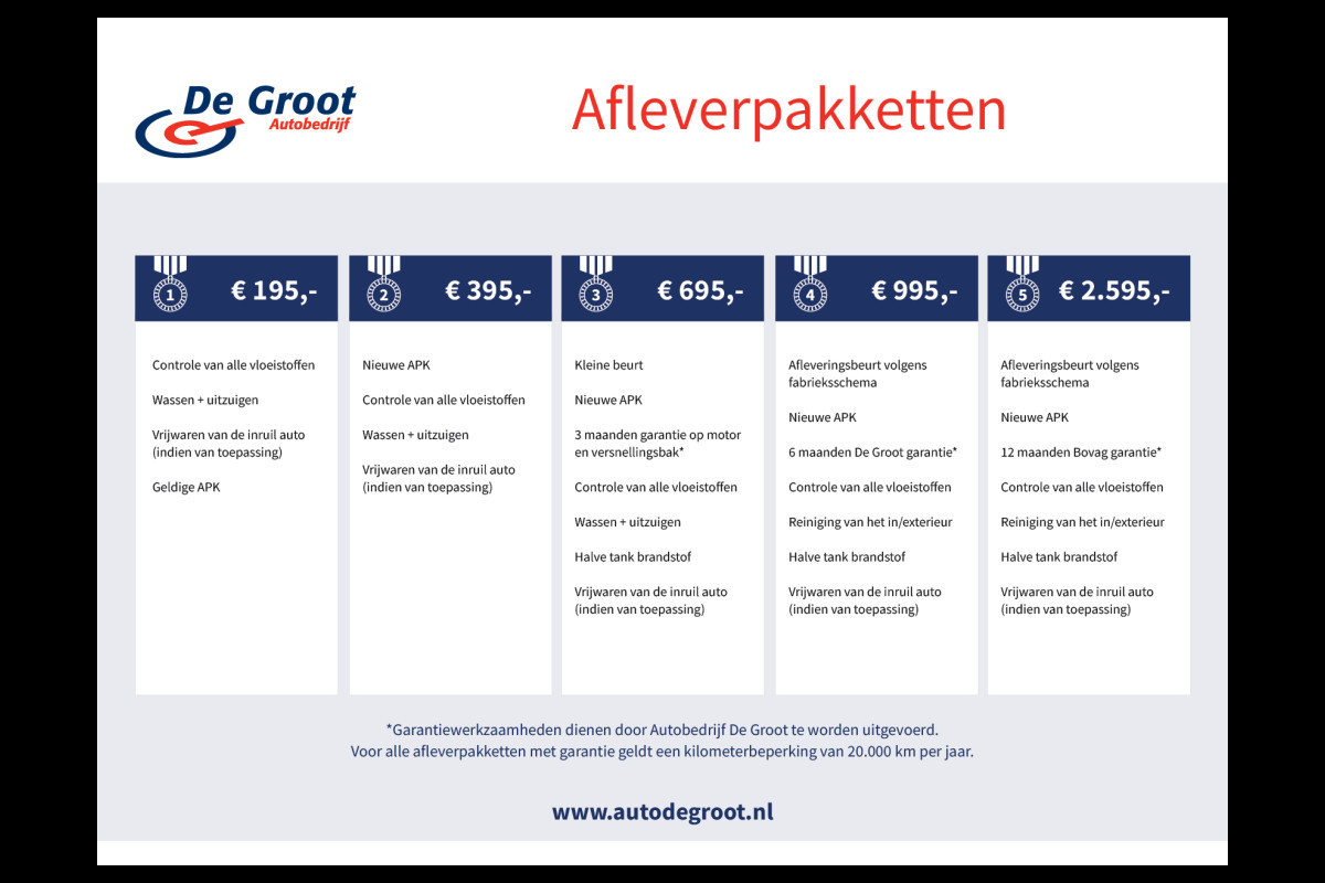 Kijk op www.autodegroot.nl of bel 0317-616901 voor meer informatie over onze afleverpakketten.