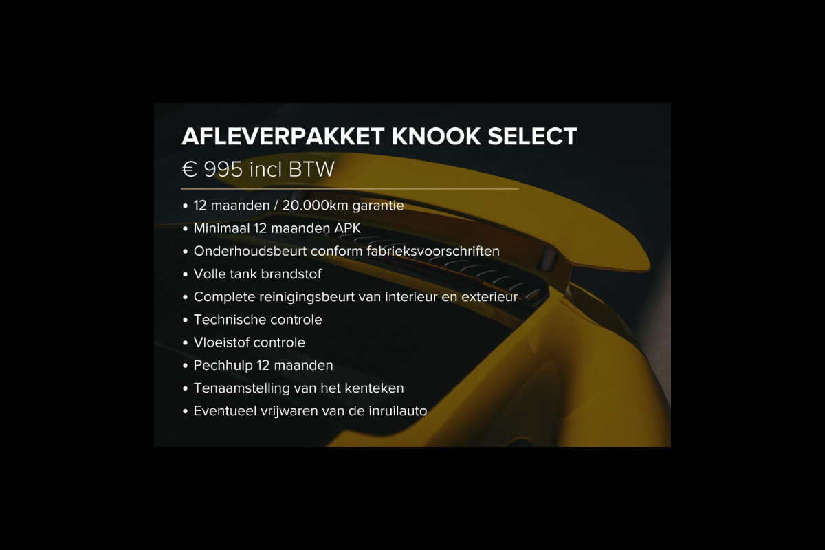 - Afleverpakket Knook Select (€ 995 meerprijs): Dit afleverpakket bevat (in plaats van afleverpakket "Basispakket"): Garantie 12 maanden / 20.000km, Minimaal 12 maanden APK, Onderhoud volgens fabrieksvoorschriften indien binnen 10.000km of 6 mnd, Pechhulp 12 maanden, Tenaamstelling van het kenteken, Volle tank brandstof