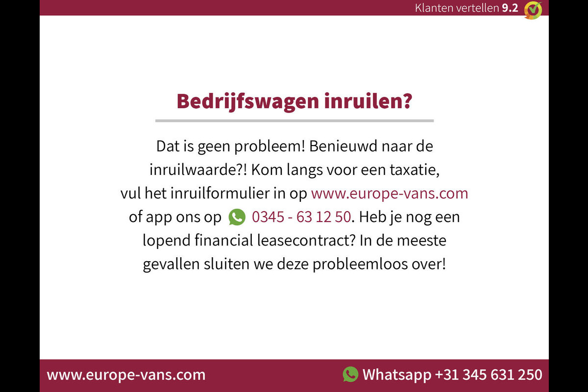 Inruil van uw huidige bedrijfswagen is mogelijk. Financial lease behoort tot de mogelijkheden, op onze site vindt u de tarieven en kunt u direct een aanvraag doen. Alle prijzen zijn exclusief 21% BTW tenzij anders vermeld. Informeer naar aanvullende voorwaarden bij particuliere verkoop. EXPORT: As official VWE-exportpartner we provide all needed documents and services.