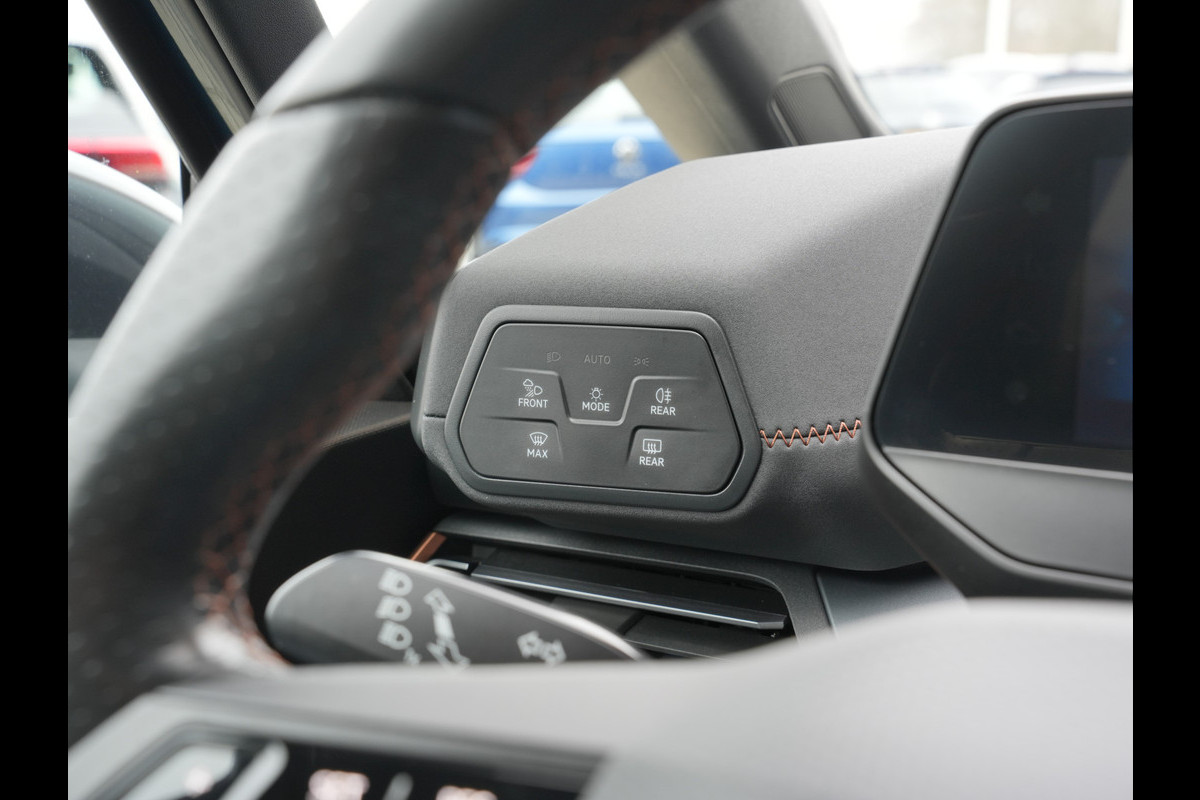 Het digitale dashboard zorgt voor een super functionele display van reisinformatie. Omdat u nou eenmaal geen ogen in uw achterhoofd heeft, is het altijd lastig om achteruit te rijden zonder brokken te maken. De achteruitrijcamera lost dat probleem op. Adaptive cruise control is een comfortabele en veilige optie. Het systeem reguleert de snelheid en houdt automatisch afstand tot uw voorligger. U weet altijd hoe de auto eraan toe is dankzij Connected Services. Ook handig voor de garage en de wegenwacht. Even de app uitlezen en klaar! Het full map navigatiesysteem en het audiosysteem (met DAB-ontvangst!) bedient u met knoppen op het stuur of met gesproken commando's. De uitrusting van deze CUPRA is met automatische airconditioning, draadloos opladen, regensensor, keyless entry, automatisch dimmende binnenspiegel en lederen stuur behoorlijk compleet.