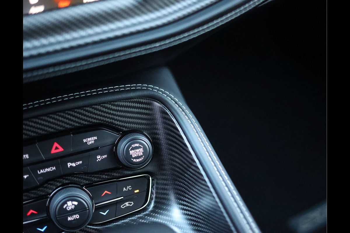 In het interieur vinden we zwart lederen en suède zetels, carbon interieurlijsten en een zwarte Alcantara binnenhemel. Zoals het hoort bij een Amerikaanse auto is het zeer comfortabel vertoeven, de auto is dan ook uitgerust met een flinke lijst opties. Denk bijvoorbeeld aan stoelverwarming en -ventilatie, Harman Kardon en Apple Carplay en Android Auto.