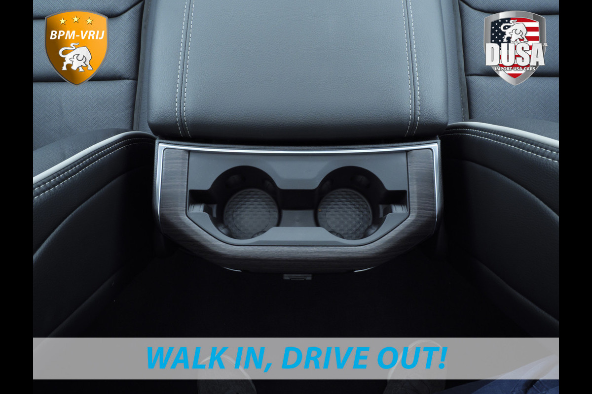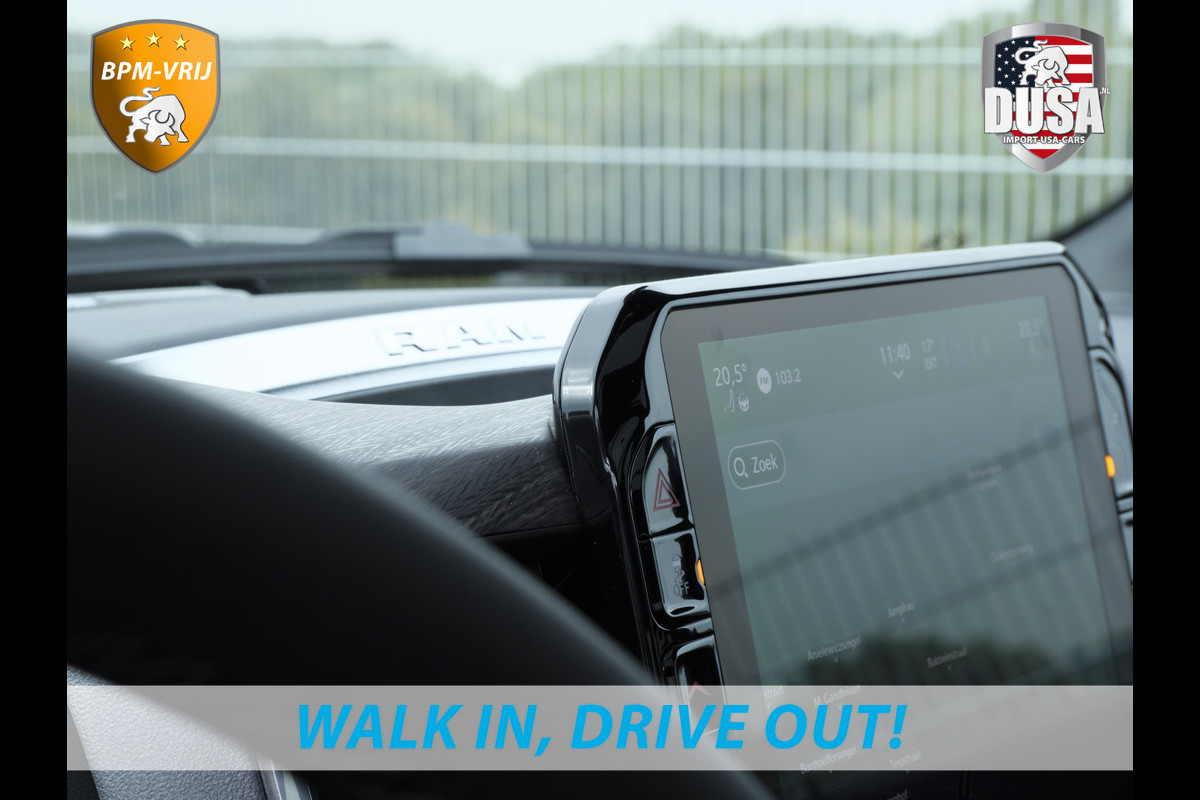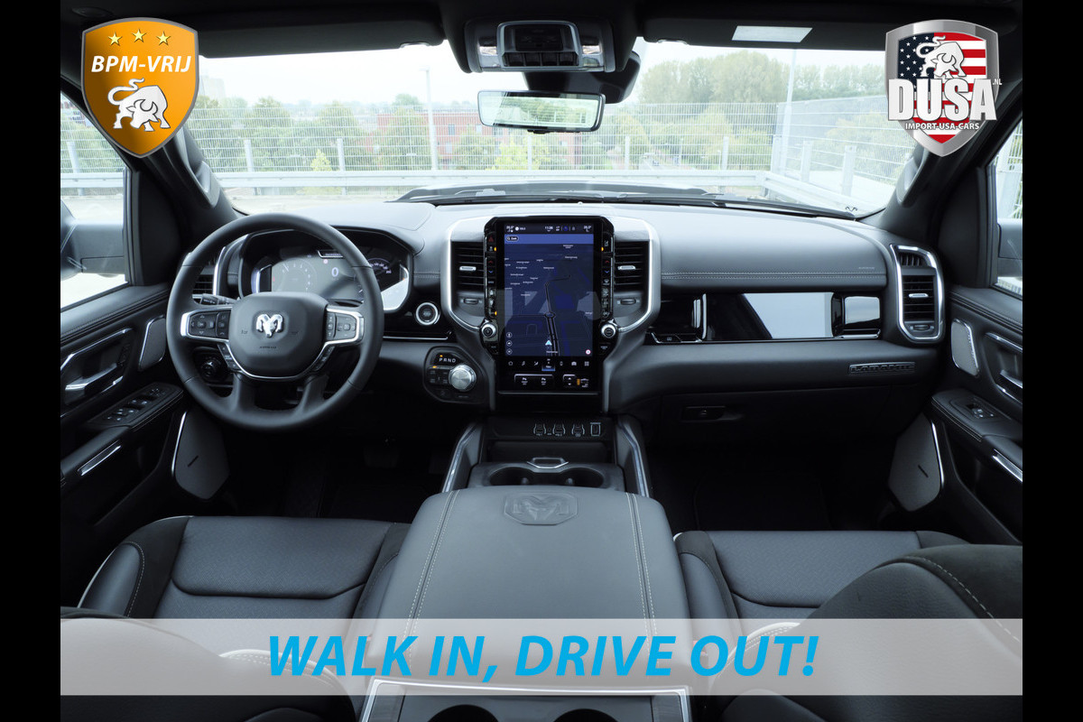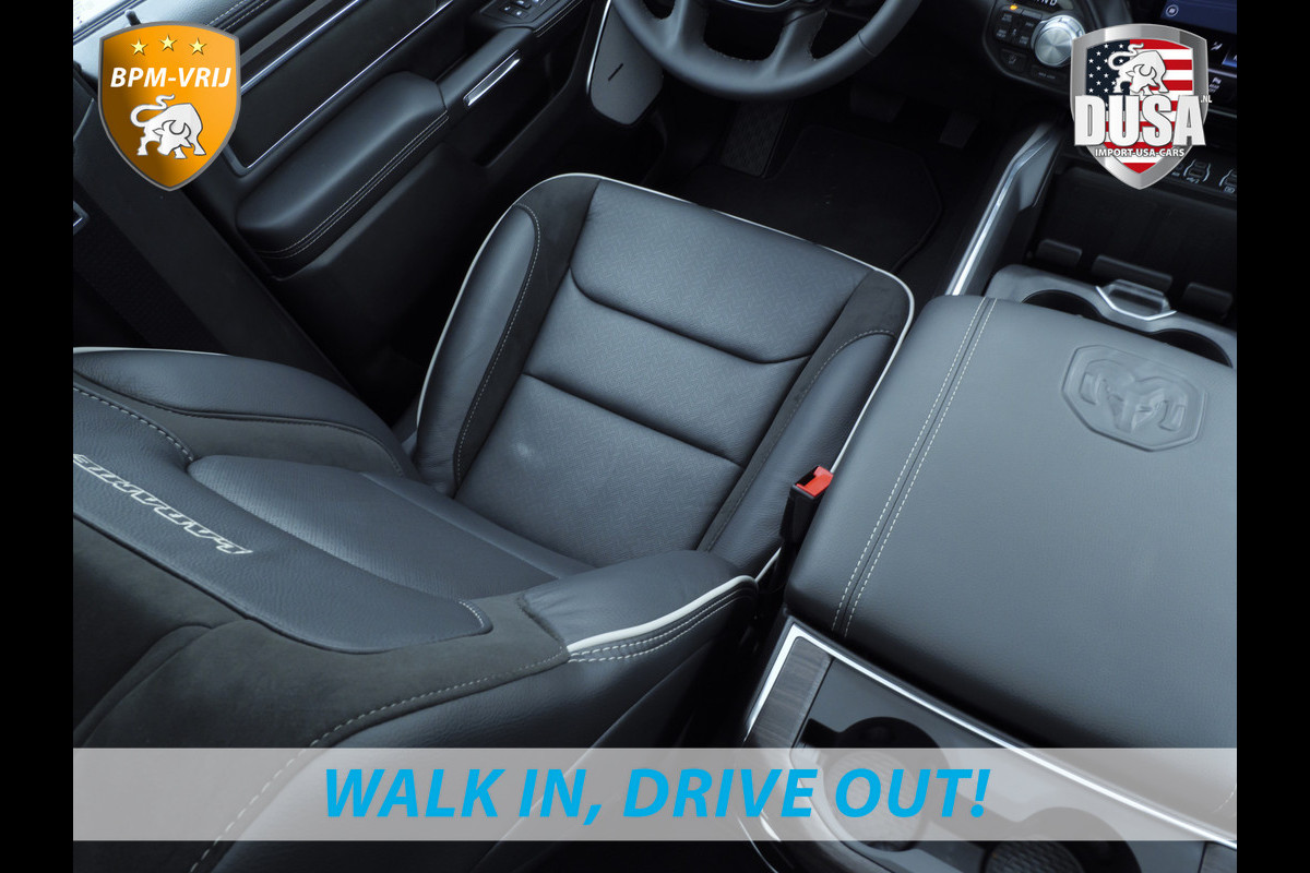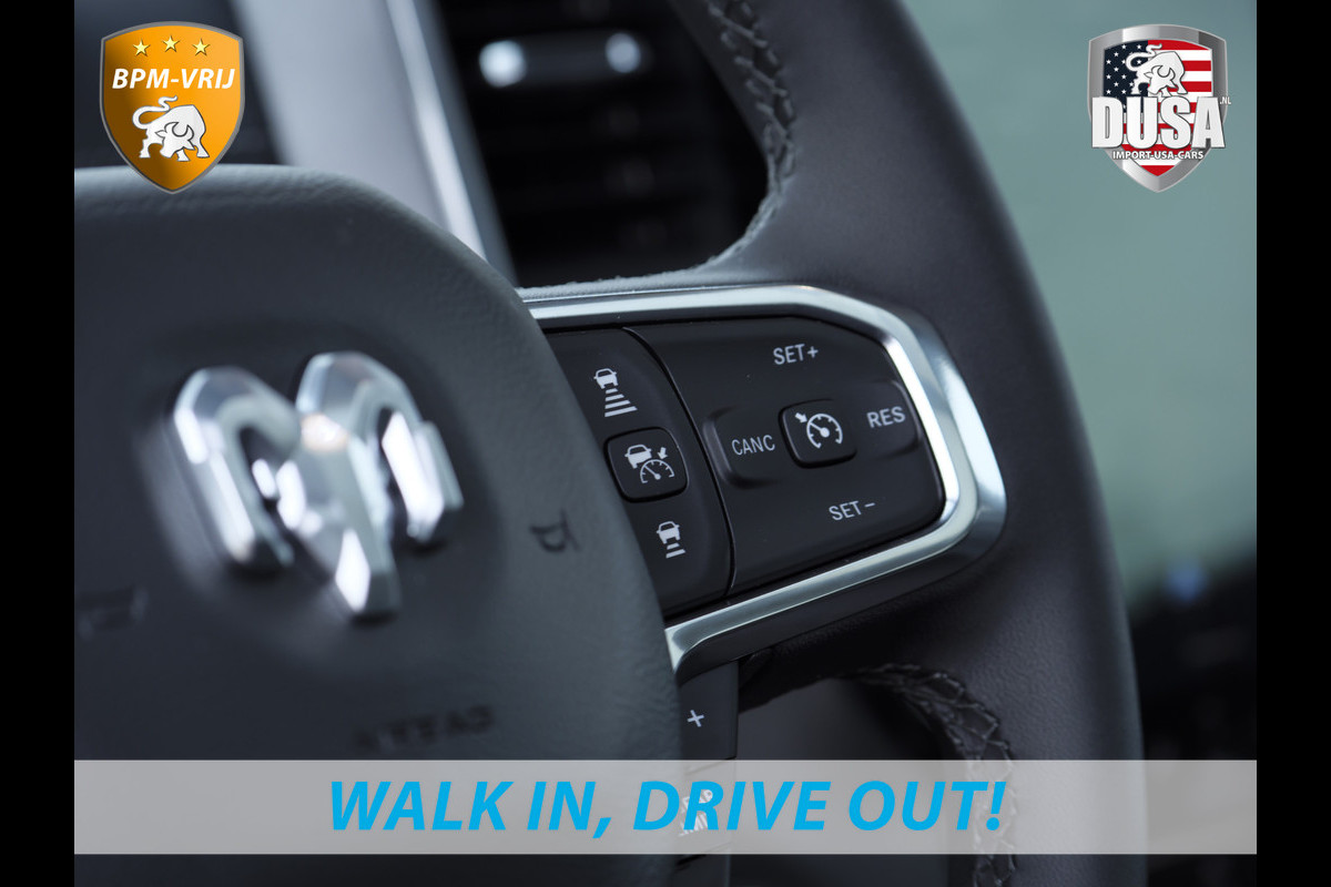 Ontspannen en zorgeloos autorijden, dat doet u met deze Dodge RAM. Deze nieuwe auto is nu uit voorraad leverbaar. Hij heeft een benzinemotor en een automatische transmissie. Ook een fijne dosis klasse is bijgeleverd, met het lederen interieur. Zit u goed? De stoelen zijn eenvoudig instelbaar dankzij de elektrische bediening met geheugen. Het interieur baadt in een zee van licht door het glazen panoramadak. Ook op de achterbank kunnen passagiers zichzelf snel opwarmen dankzij de achterbankverwarming. In deze Dodge profiteert u onder andere ook van: 22 inch lichtmetalen velgen, LED koplampen, elektrisch inklapbare buitenspiegels en treeplanken.