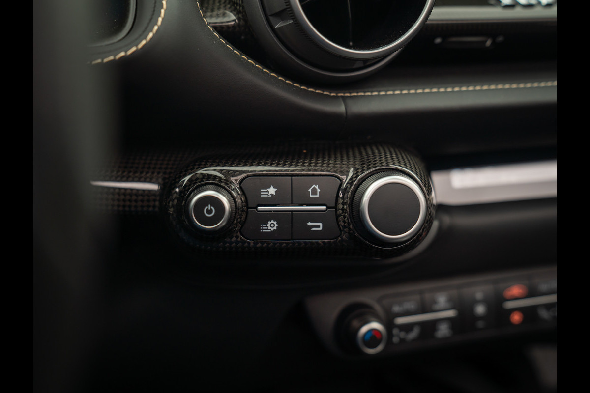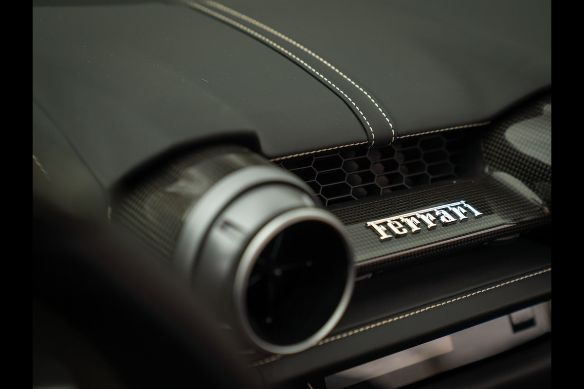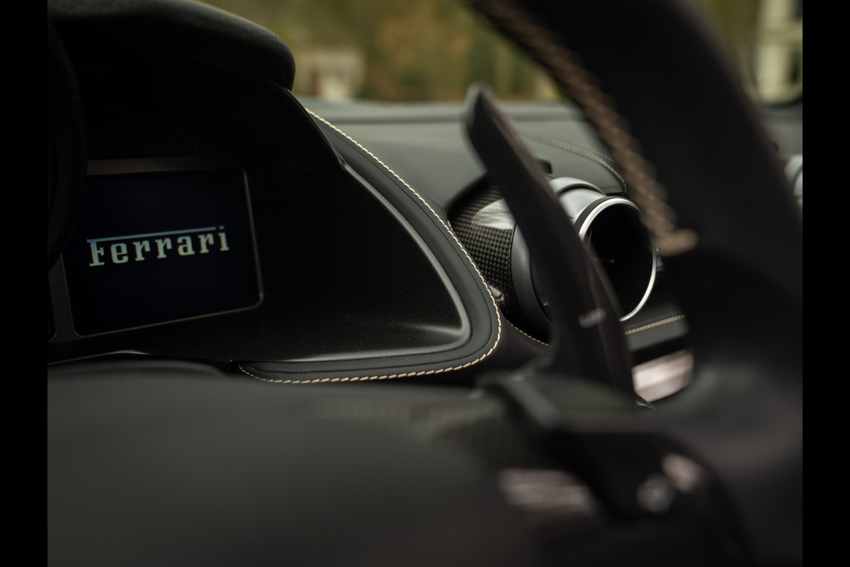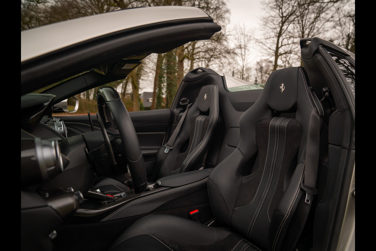 Zeggen we racy, dan zeggen we carbon. Zo ingetogen als de Nero lederen kleurstelling is in de cockpit van de Ferrari 812 GTS, zo uitbundig is de toepassing van peperdure koolstofvezel elementen: Carbon Racing Seats, Carbon Driver Zone, Carbon Central Bridge, alsook de instaplijsten en dashboard inserts zijn carbon-made. De oorspronkelijke eigenaar was duidelijk niet van het halve werk. Grigio Chiaro contraststiksels en dito Cavallino’s in de hoofdsteunen doorbreken het zwarte geheel op smaakvolle wijze. Maar de meeste aandacht verdienen toch wel de rode LED’s in het carbon stuurwiel, die vertellen wanneer het tijd is om via de carbon Shift Paddles een versnelling hoger in te schakelen. De schreeuwende 12-cilinder in het front komt ongedempt uw gehoorgangen binnen wanneer het dak eraf is. Kortom, u weet wat u te doen staat…