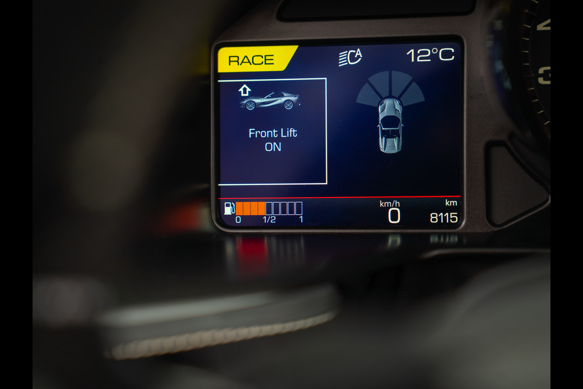 Hij is luid. Hij is snel. Hij is puur. De 6,5 liter V12 in het vooronder is atmosferisch van aard en stuurt 800 uitgelaten paarden richting de achteras. Turbo’s en hybridesystemen schitteren door afwezigheid; zo zien we ze nog zelden. Dit maakt dat het luistergenot intens en ongeremd is. Als gevolg hiervan is de euforie achter het stuur ongetemd, ongekunsteld en onbegrensd zodra de 0-100 km/h sprint binnen 3 seconden wordt afgewerkt.