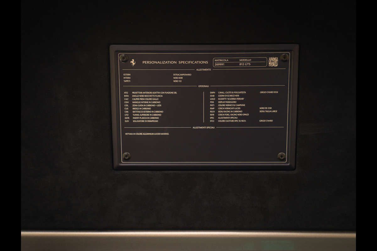 Charisma ontmoet sportiviteit. Deze fantastisch fraaie Ferrari 812 GTS is vanuit alle hoeken gezien oogverblindend mooi. En weet telkens weer te verrassen met een ander soort glans; het zeer onderscheidende, maar even elegante Aluminium Lucido metallic lakwerk speelt namelijk met de zon. De manier waarop de carrosserie belicht wordt, is bepalend voor de tint en intensiteit. Hoe dan ook is het contrast met de zwarte Racing Wheels en indrukwekkende hoeveelheid Carbon – inclusief Racing Seats, Central Bridge en Driver Zone, verbluffend te noemen. Met 8.100 km ervaring is de 800 pk sterke atmosferische Ferrari V12 amper ingereden. Tijd om in te stappen en de magie zijn werk te laten doen. De oorstrelende sound van Italiaanse power is als het perfecte charmeoffensief op weg naar snelheden tot wel 340 km/h. Vanaf de bijrijderskant is dit allemaal perfect te volgen dankzij een Passenger Display. Ook inbegrepen zijn zaken zoals Adaptieve koplampen en een Suspension Lifter. Immers, zoveel charme moet zoveel mogelijk gezien worden. Zeker ook op openbaar asfalt…