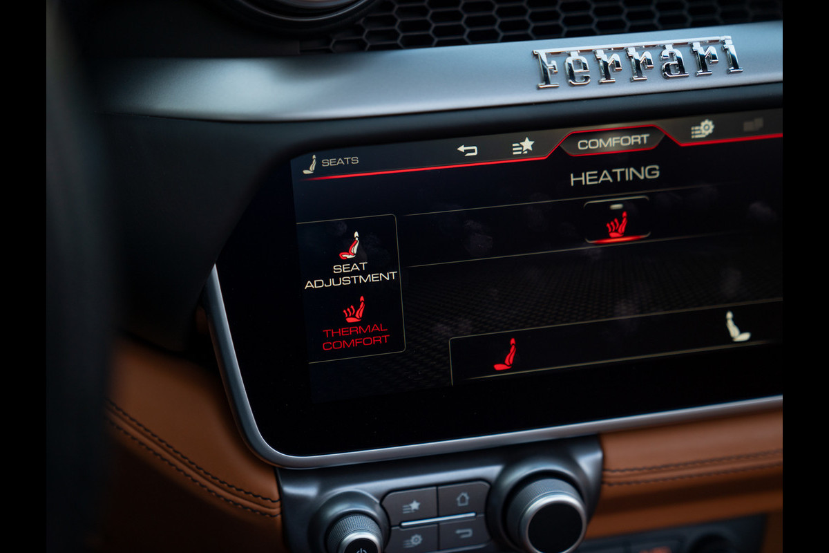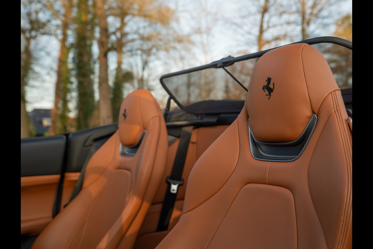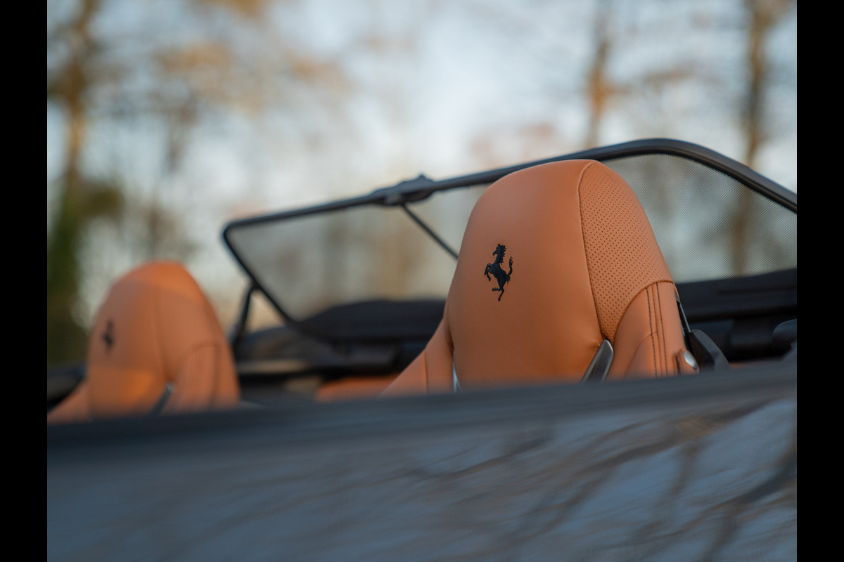 Vanbinnen blijkt deze Ferrari Portofino al net zo’n smaakmaker: we willen spontaan onze tanden in het Cuoio leder zetten. Maar gezien de performance kunnen we dat beter bewaren voor het Nero stuurwiel. Ook de bovenzijde van het lederen dashboard en de hemelbekleding zijn Nero uitgevoerd. De vloertapijten zijn op hun beurt weer Cuoio van kleur. Nero contraststiksels en dito Cavallino emblemen in de hoofdsteunen houden het two-tone interieur perfect in balans. En met het windscherm opgeklapt, heeft u optimaal zicht op de achterbank waarmee langere spullen vervoerd kunnen worden zodra de leuning is omgeklapt. Praktisch hè, zo’n open supercar van Ferrari?