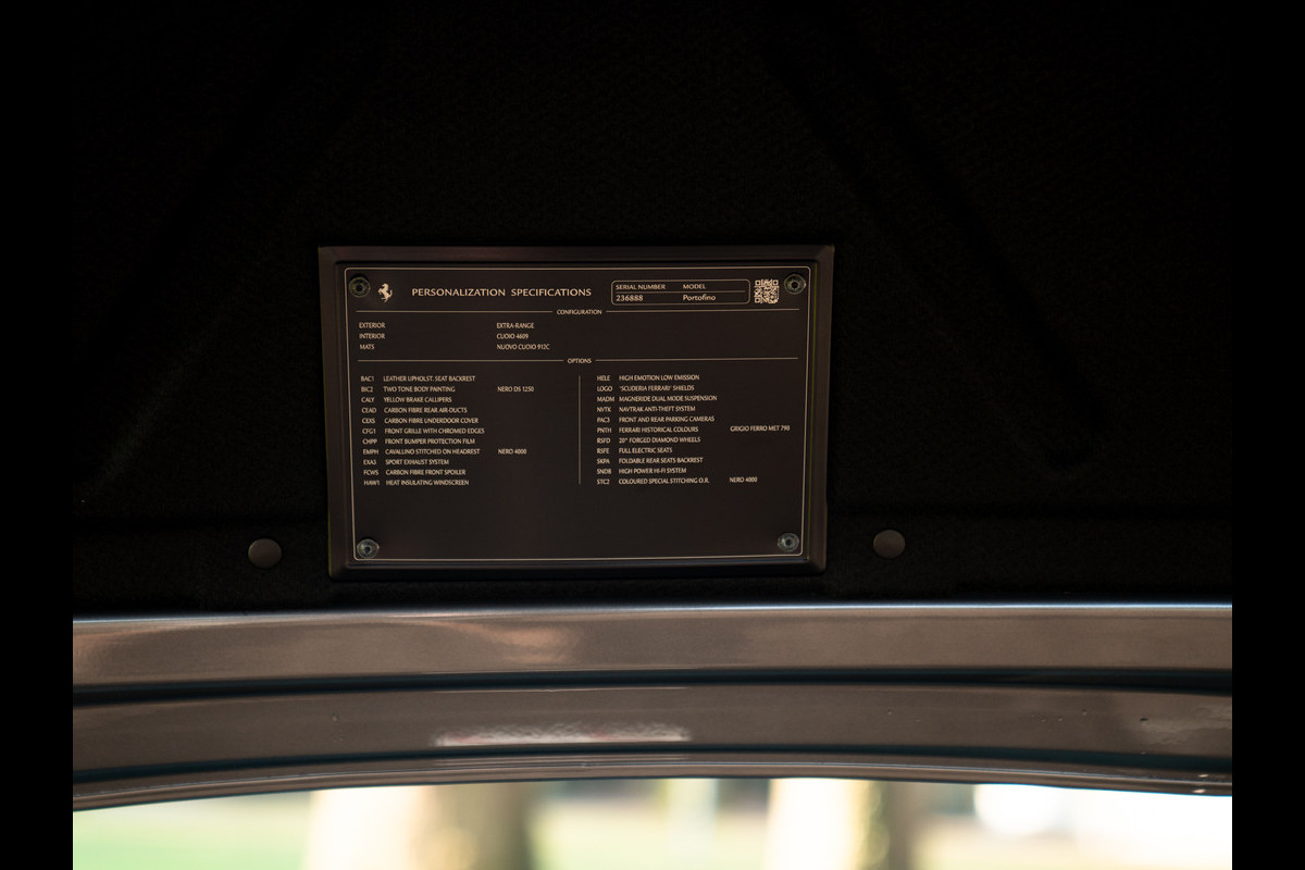 Ook het Ferrari Portofino design laat zich in geen hokje plaatsen. Natuurlijke glooiingen worden afgewisseld door strakke lijnen en geavanceerde aerodynamica. Feitelijk is de coupé-cabriolet de opvolger van de stijlvolle California. Maar op de inklapbare dakconstructie en verchroomde spijlen in de grille na is eigenlijk alles anders. De Portofino is progressiever, extremer en bovenal: een stuk sneller. Ondergedompeld in een metallic Grigio Ferro bad – een officiële Ferrari Historical “Extra Range” Colour, wordt dit bloedstollende recept uit Italië compleet opgediend inclusief smaakvolle topping. En dat kunt u vrij letterlijk nemen dankzij de hardtop, uitgevoerd in Nero DS 1250. De afwijkende tint van de metalen cabriokap creëert een two-tone kleurstelling op z’n Italiaans: om je vingers bij af te likken. En toch dwalen onze ogen automatisch af naar de carbon frontlipspoiler, sideskirts én air-ducts direct naast de achterlichtunits. Niet racy genoeg? Check dan de Giallo remklauwen achter de 20 inch Forged Diamond wielen; ze vormen qua tint een mooie match met de Scuderia Ferrari Shields op de voorste schermen. Eén keer luisteren naar de sportuitlaat is voldoende om te kunnen begrijpen dat die beschermfolie op de voorbumper geen overbodige luxe is…