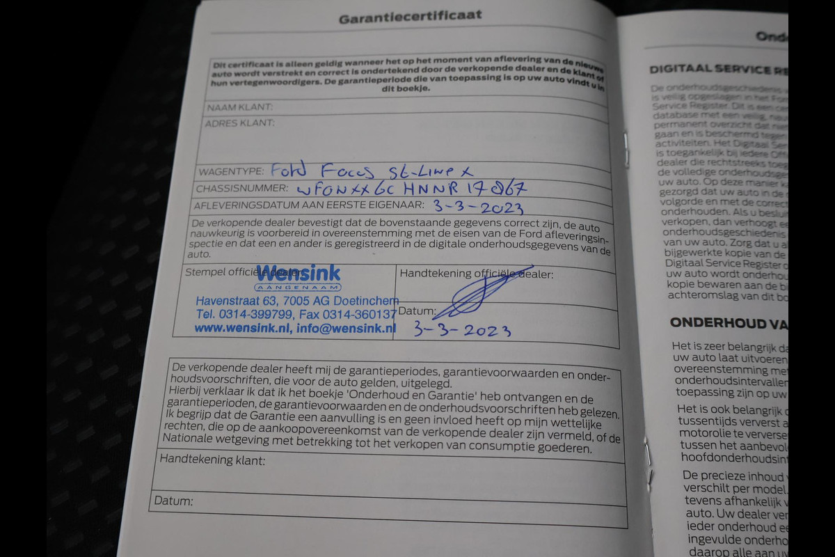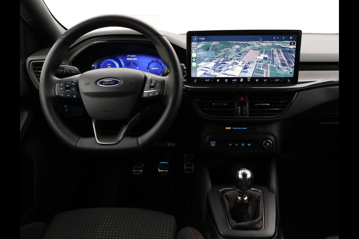 Origineel Nederlandse Focus hatchback met een RDW nieuwprijs van 41.563 euro met de sterkere 155 PK motor 1.0 EcoBoost Hybrid met 6 versnellingen, Magnetic metallic exterieurkleur, ST-Line X uitvoering met 18 inch lichtmetalen velgen en rode remklauwen, Bang & Olufson premium sound, Head-up display, Adaptive cruise control, Nieuwste type en grootste touch-screen scherm 13,2 inch SYNC4 met Navigatie, Apple Carplay / Android Auto appstreaming Google Maps, Flitsmeister, Spotify Whatsapp etc, Bluetooth en DAB+ Digitale radio. Winter pack met Stoelverwarming, Stuurwielverwarming, Elektronisch verwarmde voorruit, Climate control, Digitale cockpit / digitale tellers 12,3 inch cockpit, Lijnassistentie, Dodehoek assistentie, Full LED Koplampen, LED achterlichten, Privacy glass, Parkeersensoren, Donkere hemelbekleding, Draadloze telefoonlader, LED mistlampen, Spraakbediening, Zwarte sportstoelen met rood stiksel, Leder sportstuurwiel met rood stiksel, Achteruitrijcamera, Snelheidsafhankelijke stuurbekrachtiging, Elektrisch inklapbare buitenspiegels.