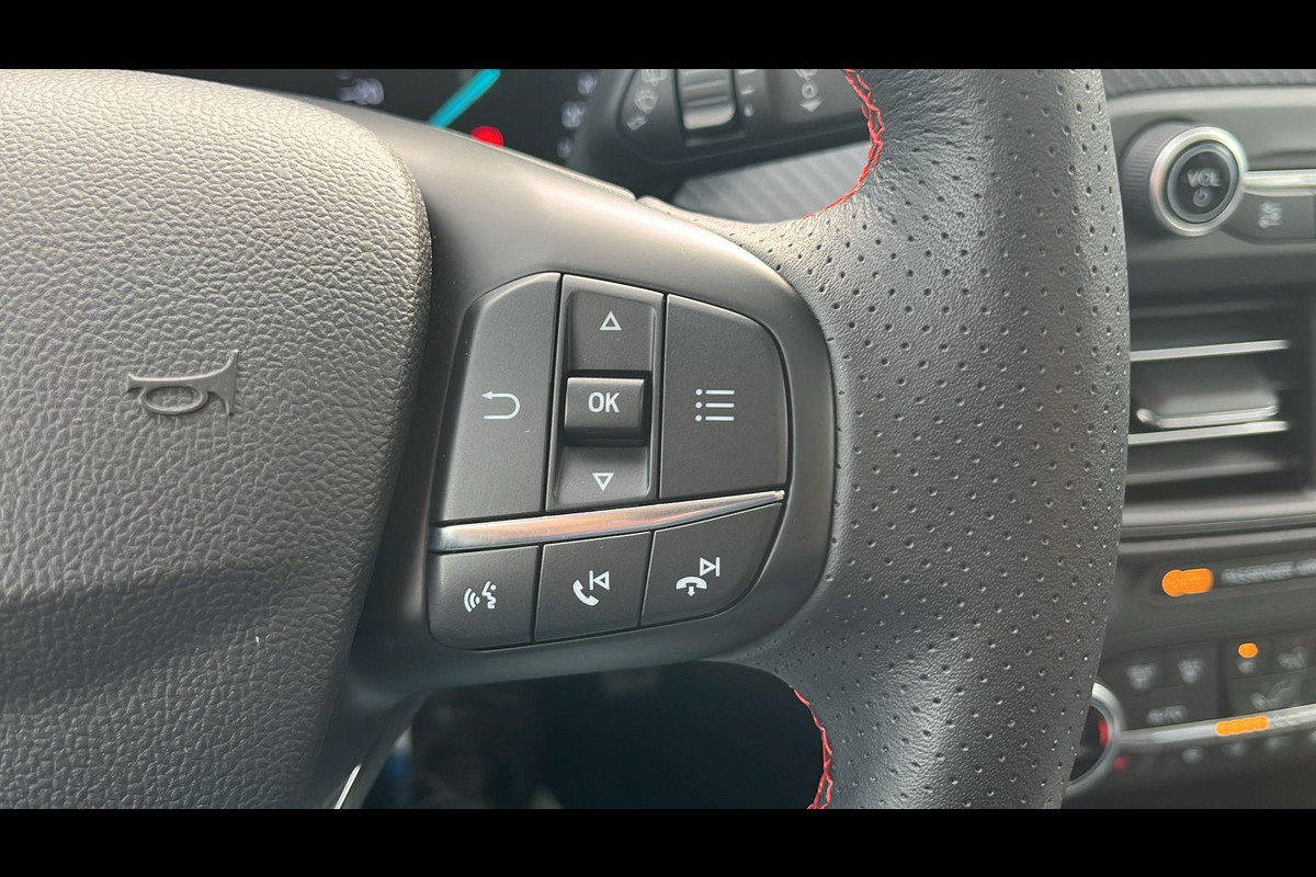 Dankzij Connected Services weet u precies waar uw auto geparkeerd staat. Ook andere functies, zoals bandenspanning en brandstofniveau, zijn via de app altijd onder handbereik. Een belangrijke veiligheidsvoorziening is de bediening van het audio-installatiesysteem en het full map navigatiesysteem, via knoppen op het stuur en middels spraakbediening. Geen gedoe met snoertjes! De draadloze telefoonlader zorgt onderweg weer voor een volle smartphone-accu. Parkeersensoren ondersteunen u tijdens het in- en uitparkeren. Lange stukken vermoeiend? Niet met de cruise control! De Ford is standaard voorzien van: sportstuurwiel, airconditioning, centrale deurvergrendeling met afstandsbediening en boordcomputer.