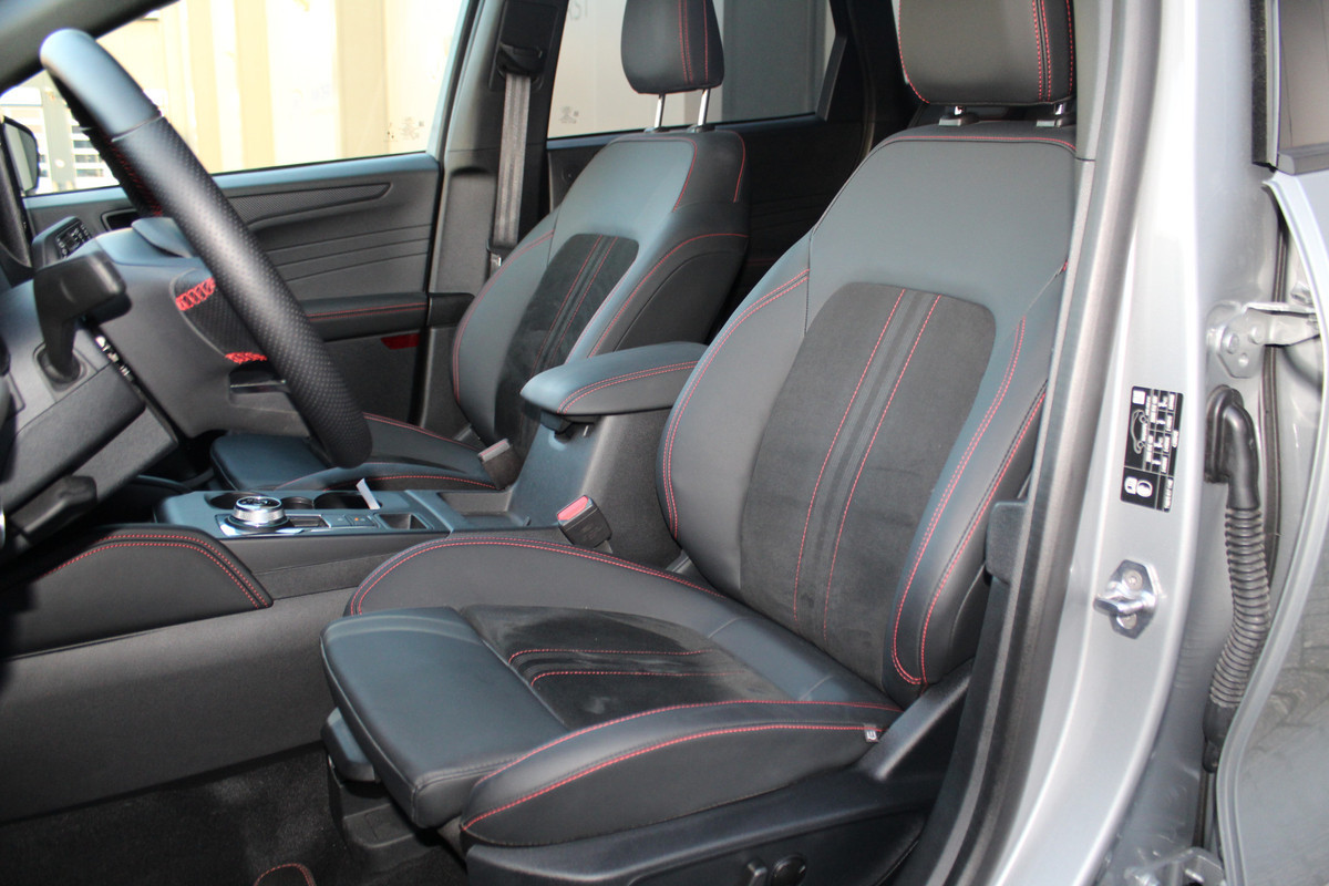 Met zijn inspirerende design en zijn uitstekende rijkwaliteiten biedt deze Ford Kuga een geweldige rijervaring. De krachtige benzinemotor staat garant voor uitstekende prestaties. Dankzij de elektrische stoelbediening is het gemakkelijk om de optimale zitpositie te vinden. Een handige voorziening op deze auto is de elektrische achterklep die u op afstand kunt openen. Op gure dagen is het ook achterin heerlijk bijkomen op de verwarmde achterbank. De koplampen zijn voorzien van de allernieuwste lichttechnologie: matrix LED-verlichting. Tot de voorzieningen van deze auto behoren 18 inch lichtmetalen velgen, geluidsisolerende ramen, zwarte hemelbekleding, in delen neerklapbare achterbank, LED-achterlichten en sportuitlaat.