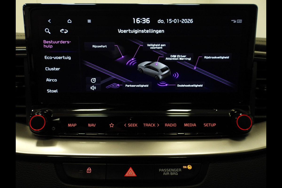 Tijdens de rit wordt u als bestuurder ondersteund door verschillende systemen die de weg en uw omgeving in de gaten houden. Bij de veiligheidssystemen van deze Kia hoort ook de verkeersbord-detectie. Die leest tijdens het rijden als het ware met u mee en attendeert u op de significante verkeersborden langs en boven de weg. Onbedoeld buiten de rijstrook raken wordt voorkomen door het Lane-keeping systeem. Forward collision warning waarschuwt bij een dreigende aanrijding en vermindert de gevolgen van een ongeval. Dankzij veiligheidsvoorzieningen als dodehoekdetectie, hill hold functie, vermoeidheidsherkenning, autonoom remsysteem en bandenspanningcontrolesysteem, bent u steeds veilig onderweg.