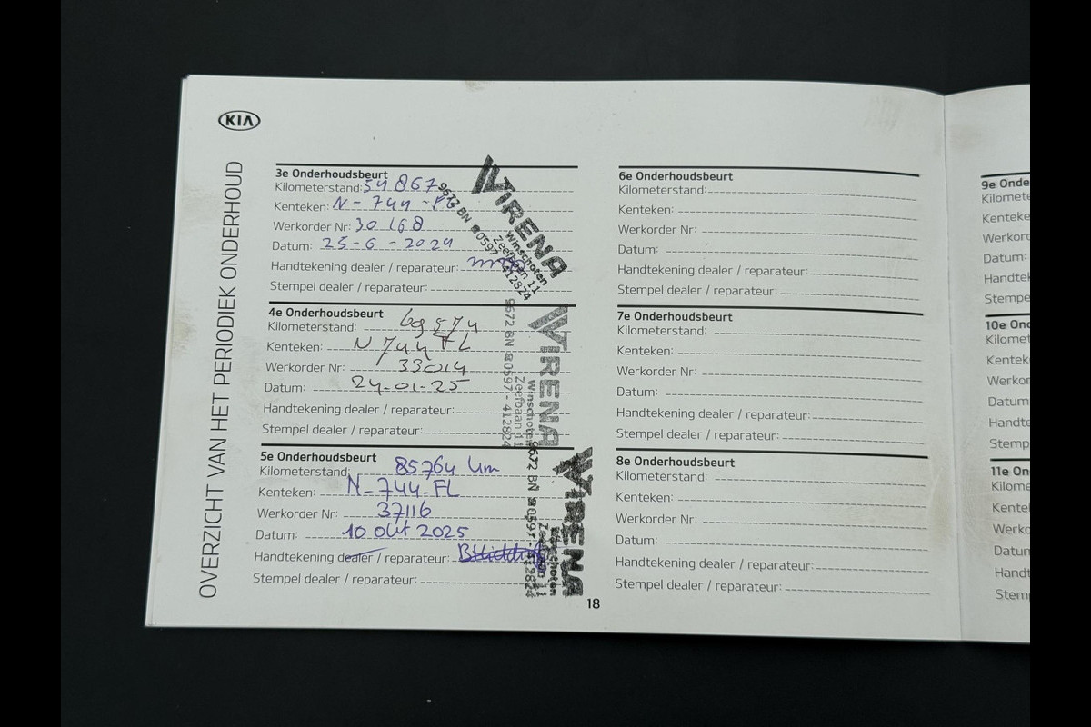 De laatste onderhoudsbeurt is uitgevoerd op 10-2025 bij 85.764 km door de officiële Kia-dealer.