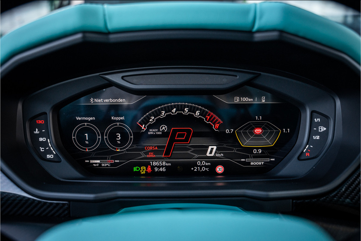 Het digitale dashboard is een perfecte bijrijder. Alles benodigde informatie is permanent zichtbaar of opvraagbaar. Met de 360 graden camera kunt u elk detail rond de auto zien, waardoor mogelijke schade door verkeerd inschatten van afstanden vermeden wordt. Adaptive cruise control houdt de ingestelde snelheid vast en houdt afstand tot het voertuig voor u. In de file rijden vreet concentratie. Daarom komt de file assistent te hulp om veilig afstand te houden en automatisch te stoppen als uw voorligger stilstaat. In één oogopslag weet u de complete systeemstatus van deze auto. Dankzij Connected Services. De Lamborghini is standaard voorzien van: dashboard met spraakbediening, high performance audiosysteem, full map navigatiesysteem, WIFI-hotspot, kruisend verkeer detectie en automatische airconditioning.