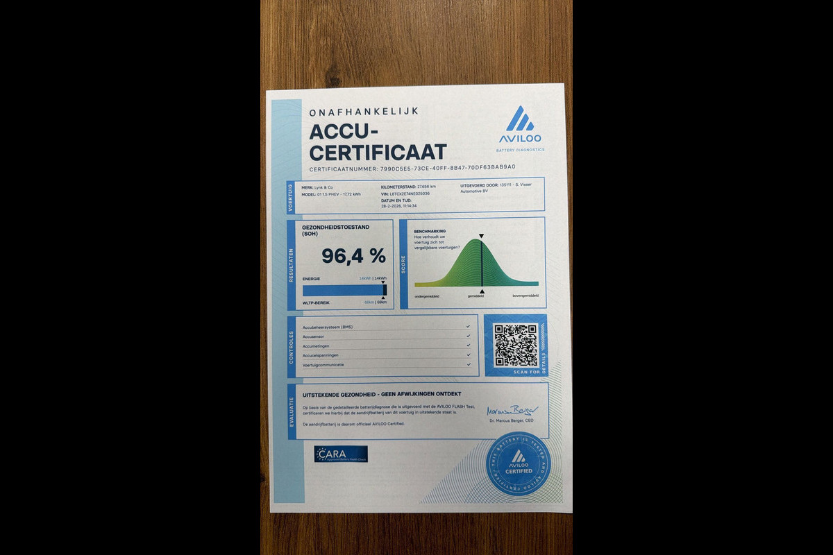 Na de meting ontvangt u van ons een officieel certificaat met de vastgestelde SOH-waarde, dit biedt transparantie en zekerheid bij aankoop.