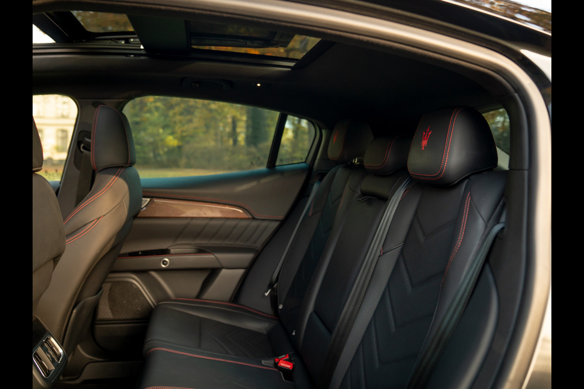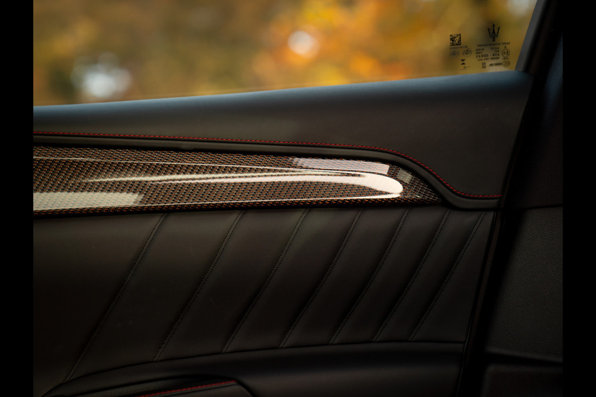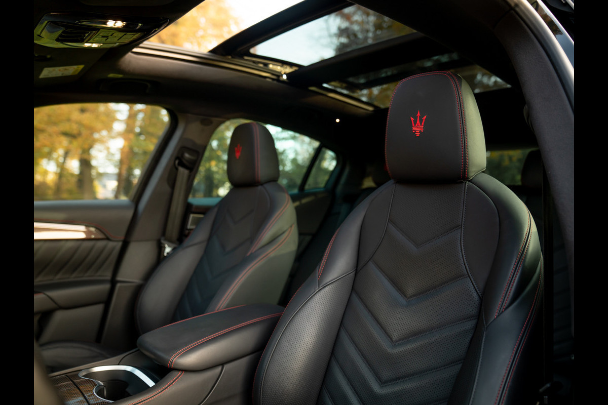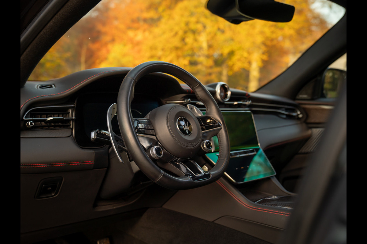 Rood is meteen ook de draad door het Nero lederen Maserati Grecale interieur. Letterlijk. Rosso contraststiksels op álle lederen delen – inclusief stoelen, hoofdsteunen, midden-/tunnelconsole, middenarmsteun, dashboard (boven + onder), deurpanelen en instrumentenpaneel, maken dat de Italiaanse SUV nóg meer een stijlvolle verschijning is. Uitzondering op de Rosso regel is het Nero lederen stuurwiel inclusief airbagkap met zwart stikselwerk. U wilt immers ook niet al te veel worden afgeleid zodra uw rijgedrag snelle handen vereist… Grote aluminium schakelflippers en een prachtige carbon inleg in de portieren + het middendeel van de tunnelconsole leggen de nadruk op pure performance. Dat het weefsel in het koolstofvezel nota bene ook rode accenten bevat, maakt onze Grecale specialer dan speciaal. Het grote glaswerk van het elektrische panoramadak moet de donkere hemelbekleding compenseren qua ruimtelijke ervaring. Aan elk detail is gedacht! Enkel de nieuwe eigenaar ontbreekt nog…