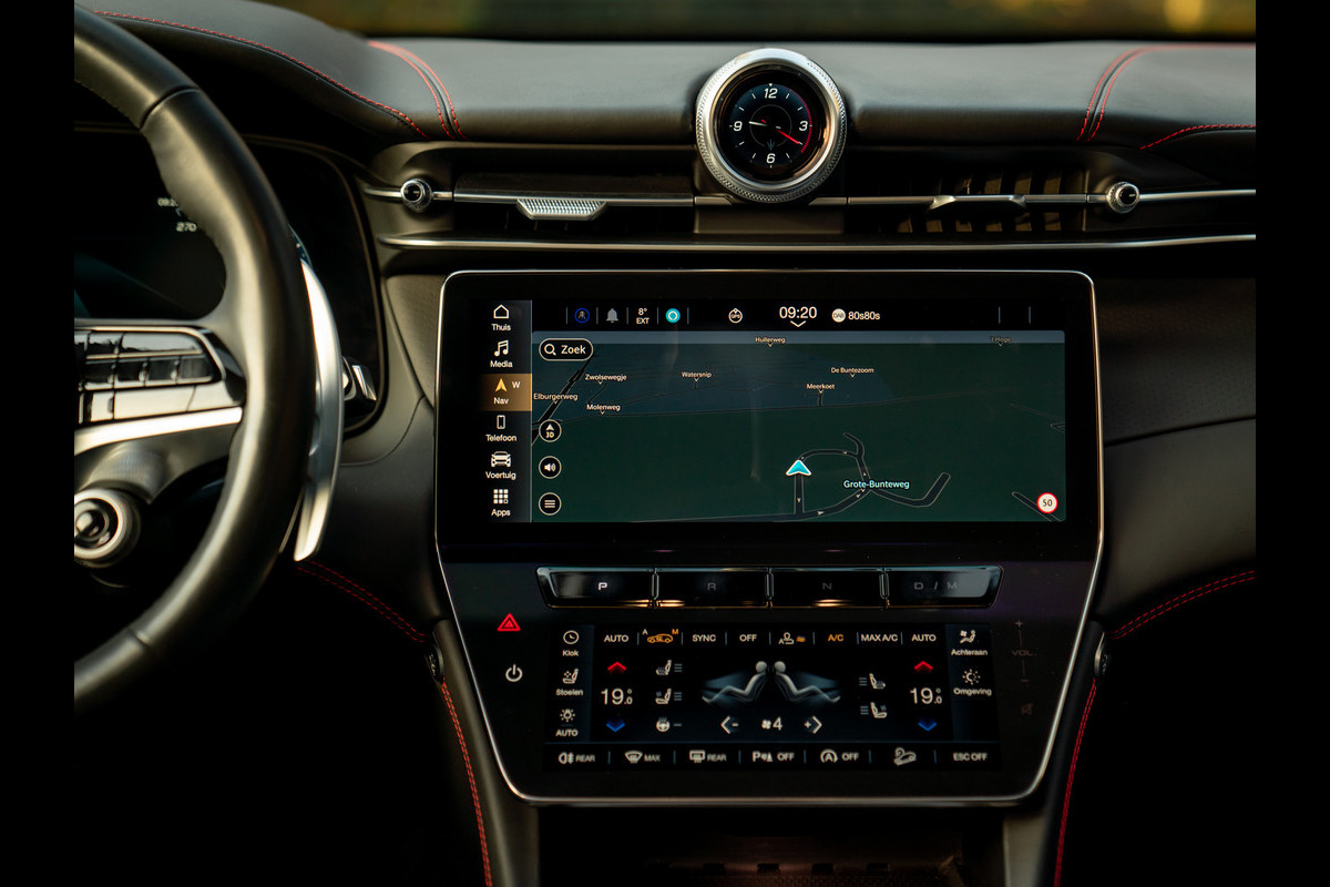 Voordat alle 330 luxepaarden op het asfalt worden losgelaten, graag uw aandacht voor het indrukwekkende uitrustingsniveau: zowel stoelen als stuurwiel zijn verwarmd, ook zijn de stoelen te ventileren, het panoramische dak is verschuif- én kantelbaar, maar ook een 360 camera is aanwezig. Verder dragen zaken zoals Adaptive Cruise Control, Lane Assist en een Head-up Display bij aan de veiligheid van de Maserati Grecale. Hoe meer ontspanning aan boord, hoe beter? Het hoogwaardige Sonus Faber audiosysteem klinkt werkelijk oorstrelend. Gekoppeld aan Apple CarPlay hoort u uw favoriete melodieën nu eindelijk zoals de artiesten het hebben bedoeld; zuiver als digitale instrumenten. Oh wacht, die zitten er ook op…