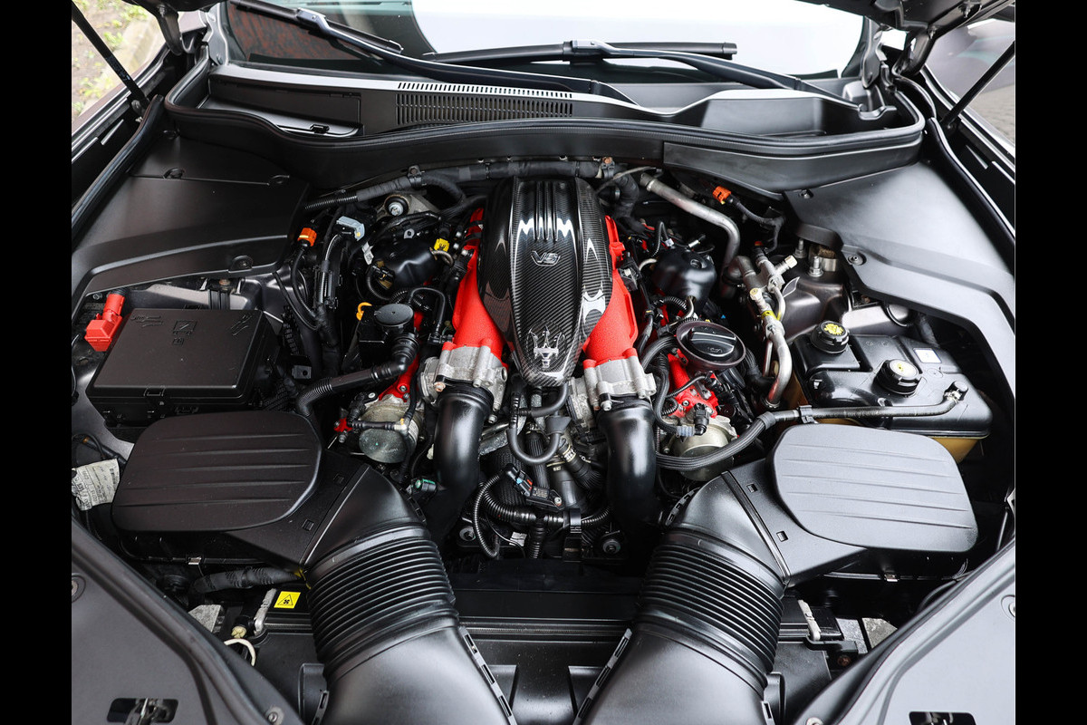 Uitgevoerd in het stijlvolle Grigio Maratea metallic, ademt dit exemplaar ingetogen klasse. De gespierde lijnen, brede wielkasten en karakteristieke grille met drietand verraden echter direct dat er iets bijzonders schuilt onder de motorkap. En dat klopt. Achter het tridente-logo schuilt namelijk een door Ferrari ontwikkelde 3,8-liter V8 biturbo, goed voor 580 pk. Een motor die niet alleen fenomenaal presteert, maar ook klinkt als een Italiaans operaorkest.