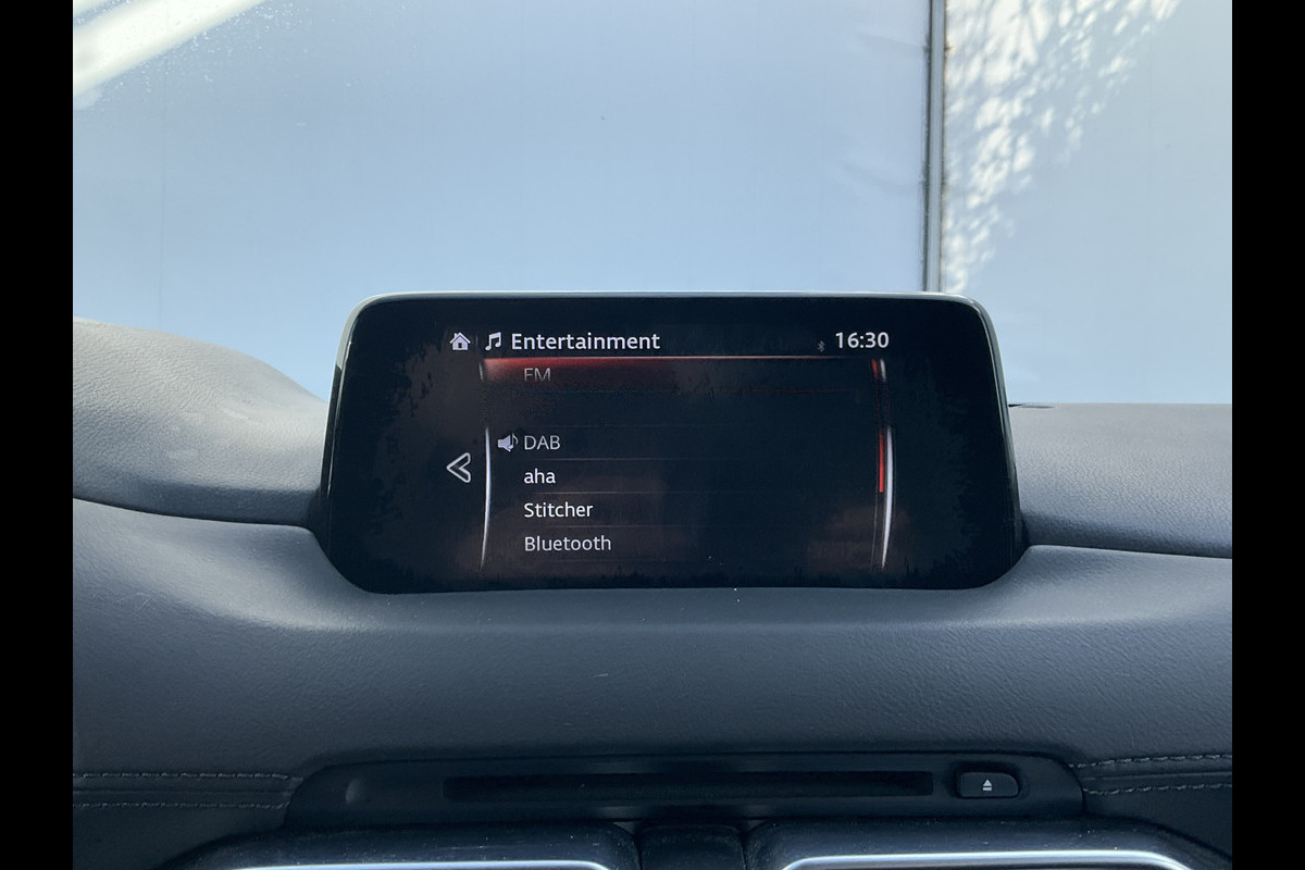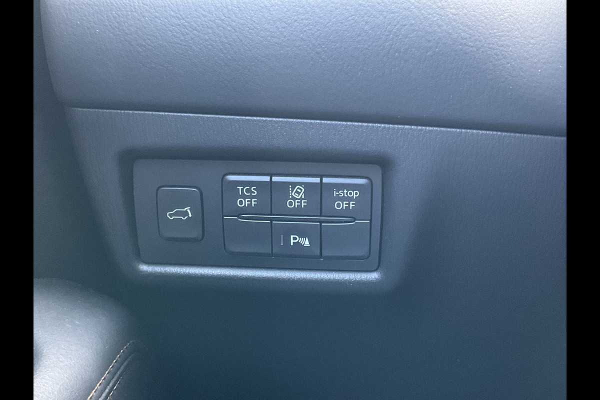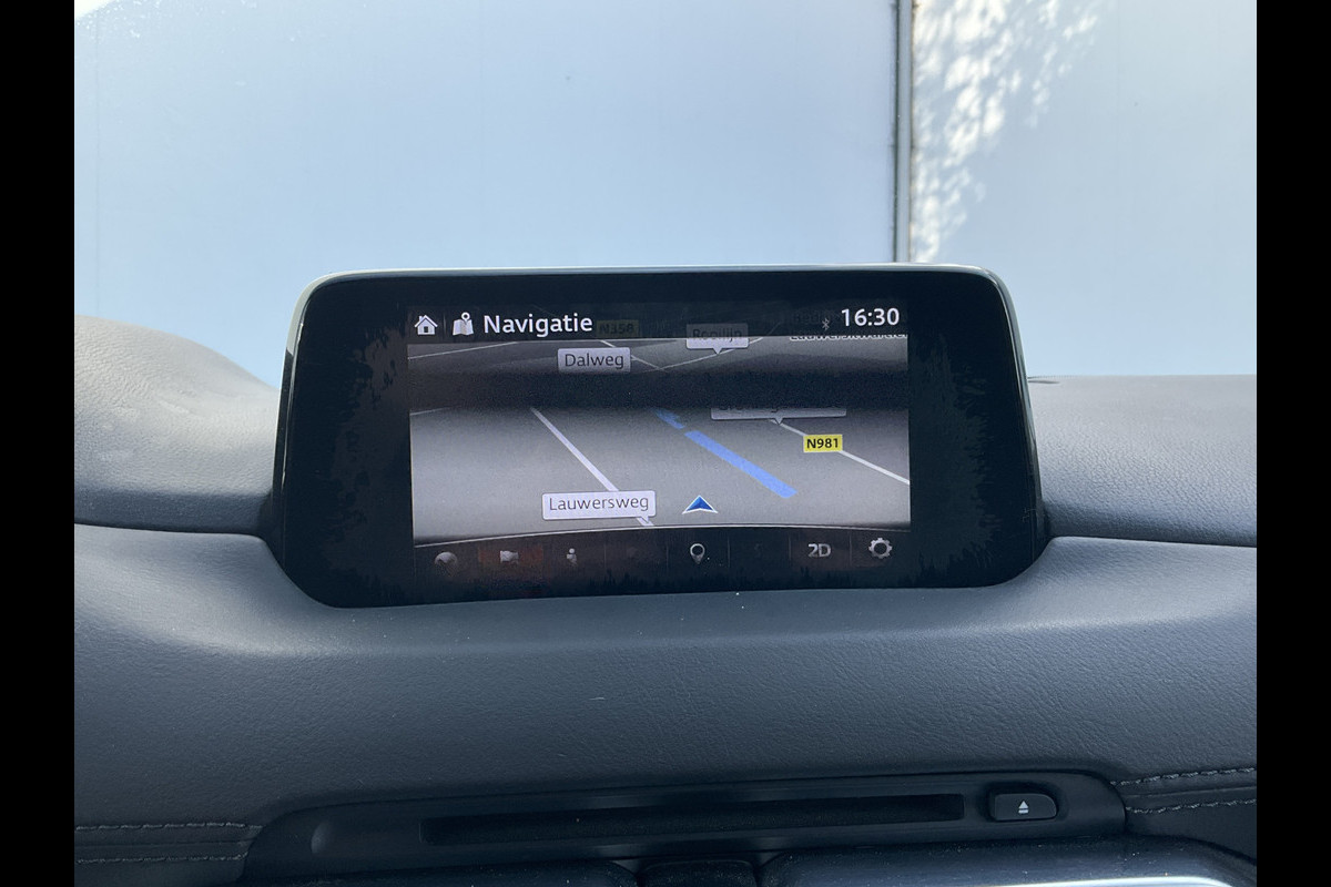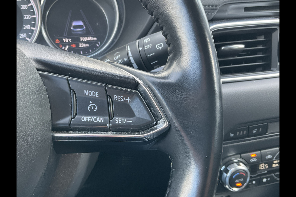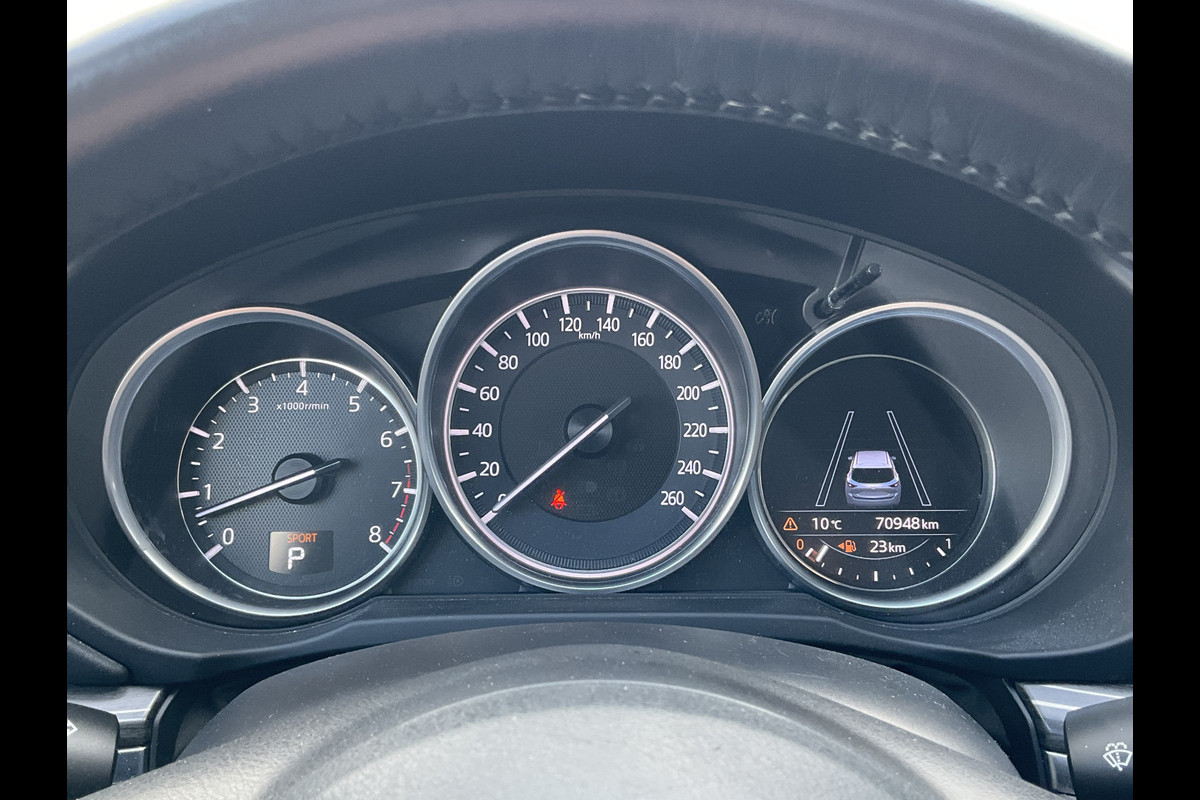 Zoals u mag verwachten van deze Mazda CX-5 is hij uitgerust met een reeks aan actieve veiligheidssystemen. In het instrumentarium kunt u bovendien de verkeersborden zien die u onderweg tegenkomt. Zo helpt deze Mazda u om veiliger te rijden. Het Lane-keeping systeem doet precies wat nodig is: waarschuwen en corrigeren bij onbedoelde overschrijding van de rijstrooklijnen. Het forward collision warning-systeem waarschuwt indien een botsing dreigt met een voorliggend of tegemoetkomend voertuig. Bovenop deze veiligheidsfeatures heeft deze Mazda bovendien head-up display, dodehoekdetectie, hill hold functie, brake assist, vermoeidheidsherkenning en bandenspanningcontrolesysteem.