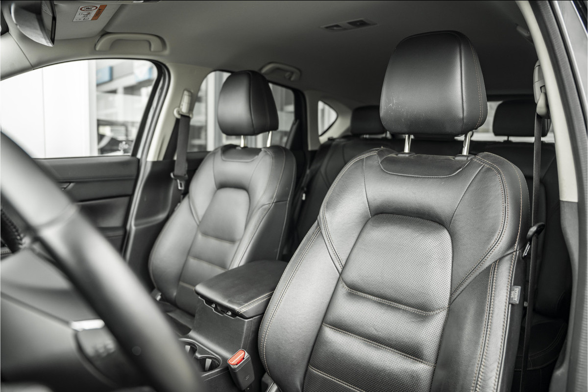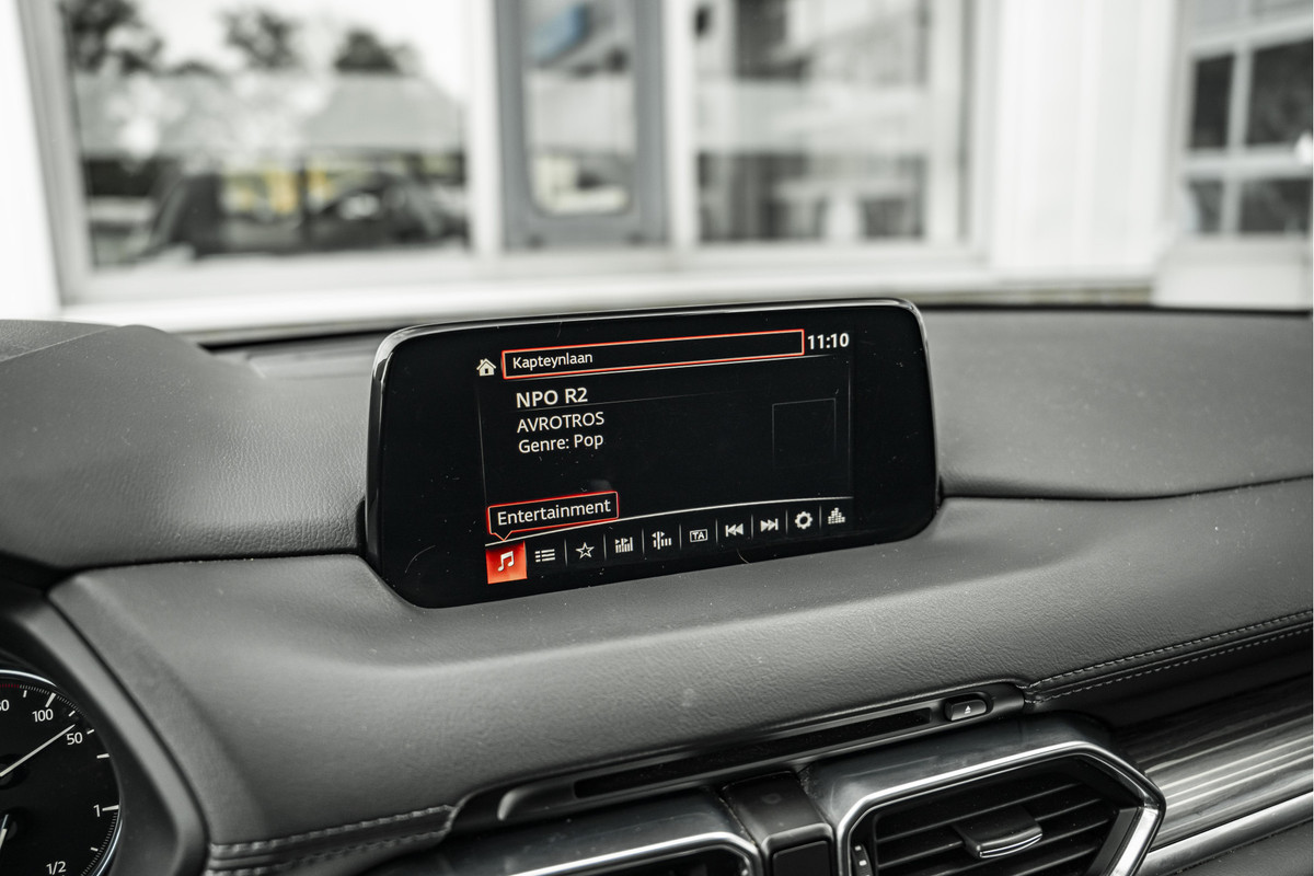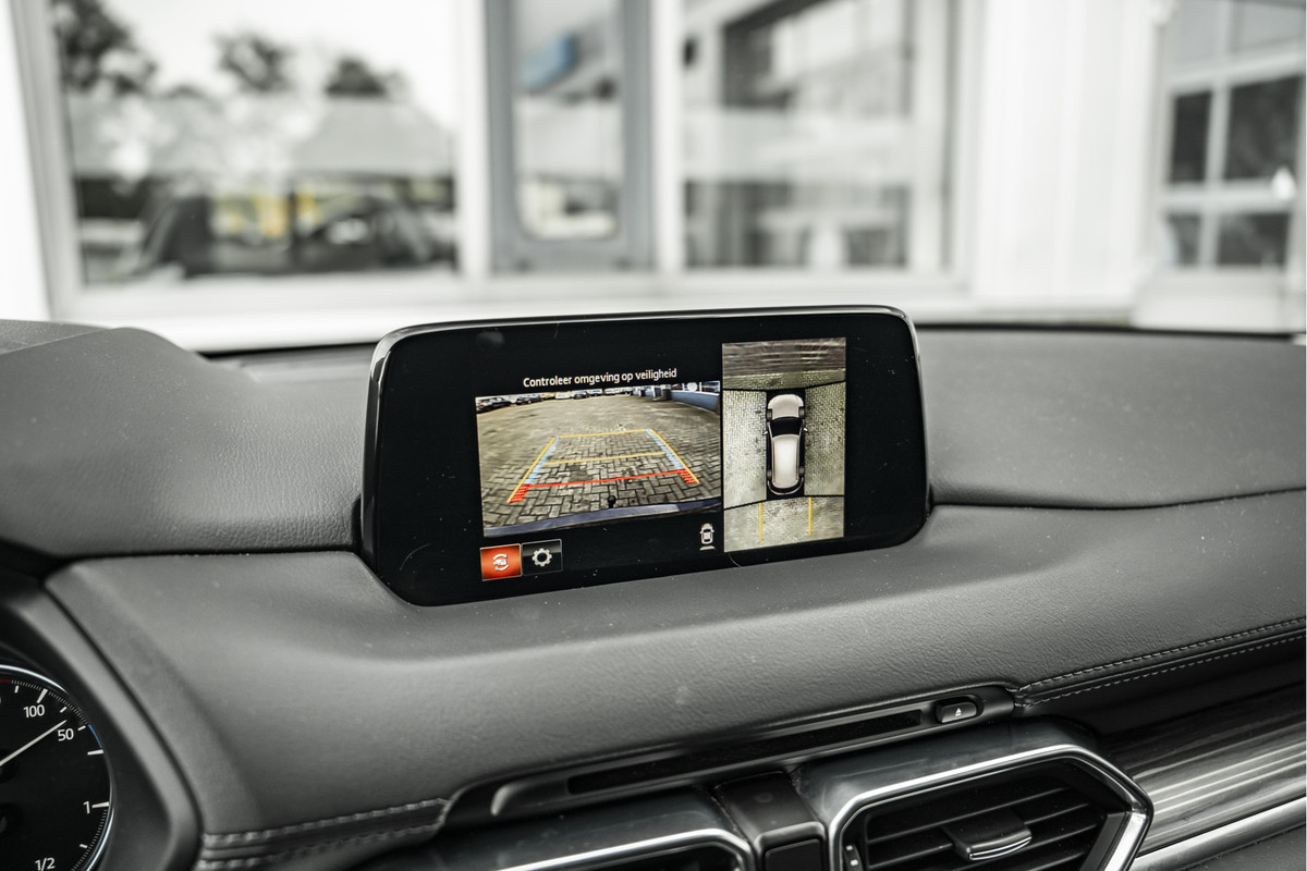 Zoals u mag verwachten van deze Mazda CX-5 is hij uitgerust met een reeks aan actieve veiligheidssystemen. Dat de auto steeds meer taken van de bestuurder overneemt, merkt u bijvoorbeeld aan het systeem voor verkeersbord-detectie in deze auto. Het Lane-keeping systeem zorgt voor een automatisch constante positie binnen de rijstrook. Afdwalen is uitgesloten. Forward collision warning waarschuwt bij een dreigende aanrijding en vermindert de gevolgen van een ongeval. Verder is deze auto uitgerust met head-up display, dodehoekdetectie, hill hold functie, brake assist, vermoeidheidsherkenning en bandenspanningcontrolesysteem.