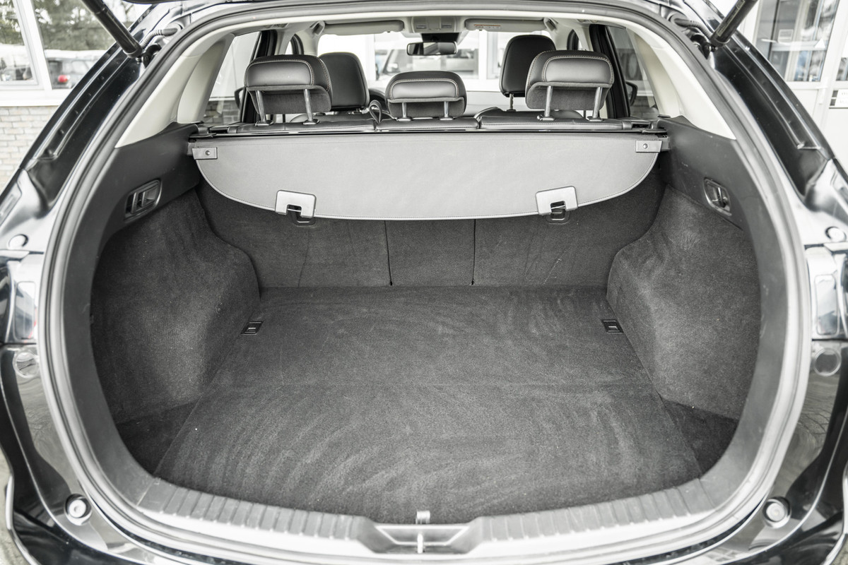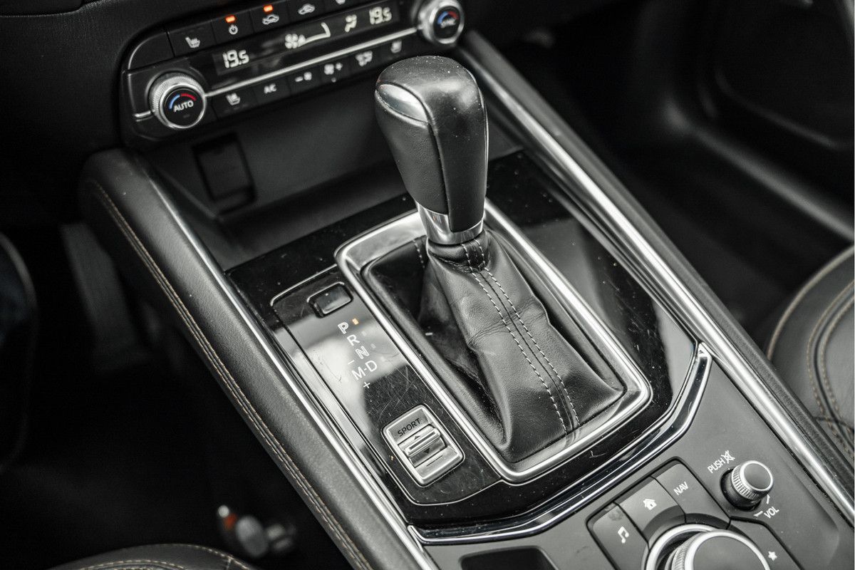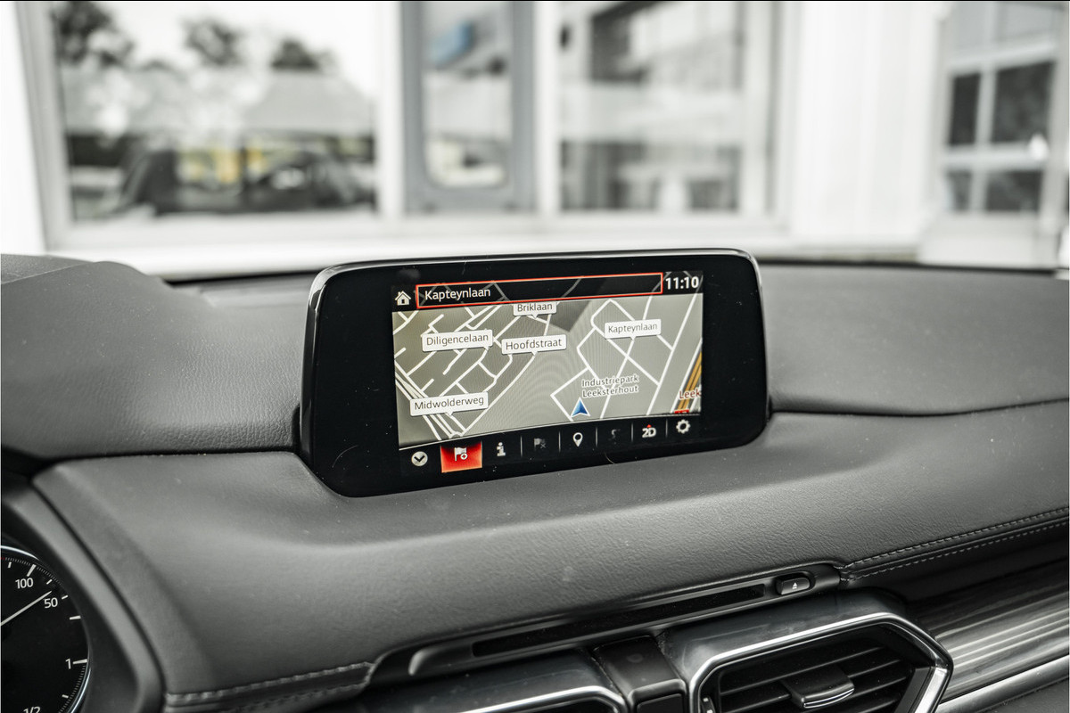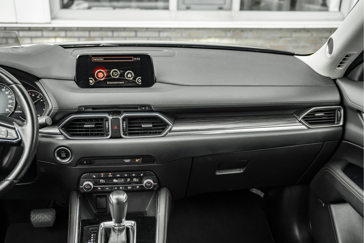 Zoals u mag verwachten van deze Mazda CX-5 is hij uitgerust met een reeks aan actieve veiligheidssystemen. Dat de auto steeds meer taken van de bestuurder overneemt, merkt u bijvoorbeeld aan het systeem voor verkeersbord-detectie in deze auto. Het Lane-keeping systeem zorgt voor een automatisch constante positie binnen de rijstrook. Afdwalen is uitgesloten. Forward collision warning waarschuwt bij een dreigende aanrijding en vermindert de gevolgen van een ongeval. Verder is deze auto uitgerust met head-up display, dodehoekdetectie, hill hold functie, brake assist, vermoeidheidsherkenning en bandenspanningcontrolesysteem.