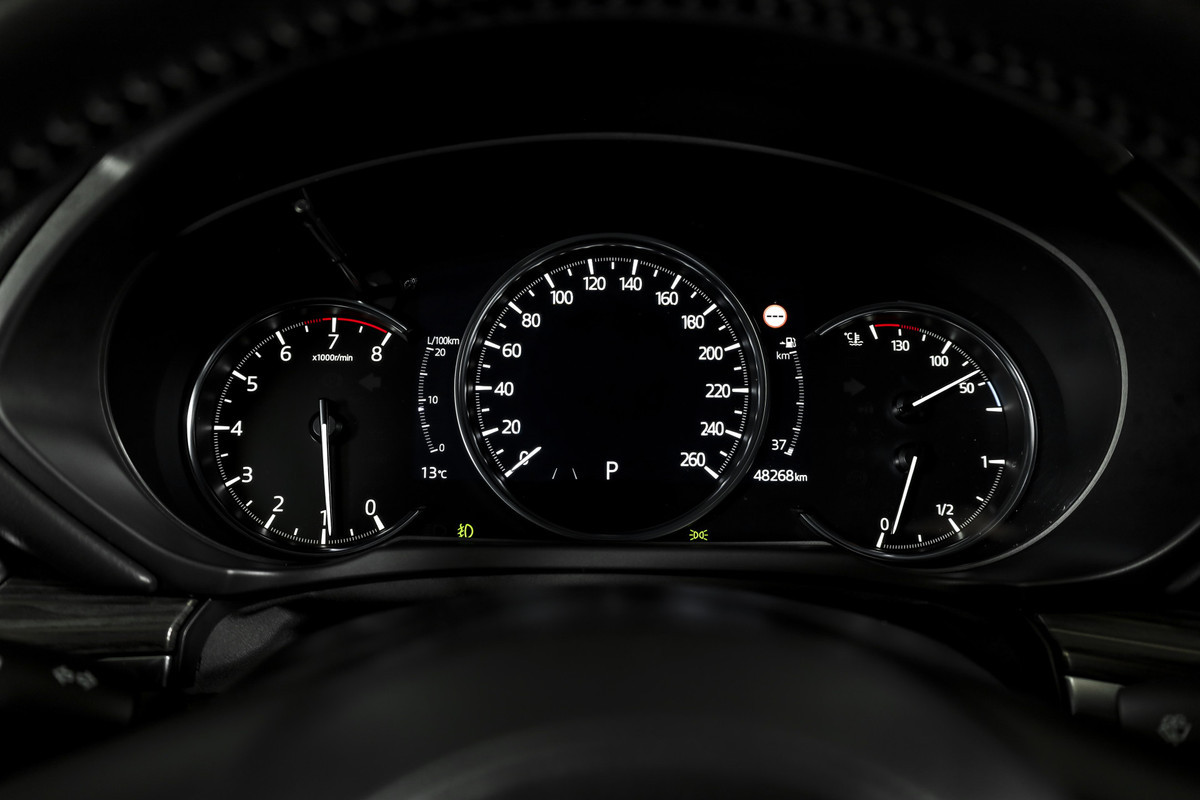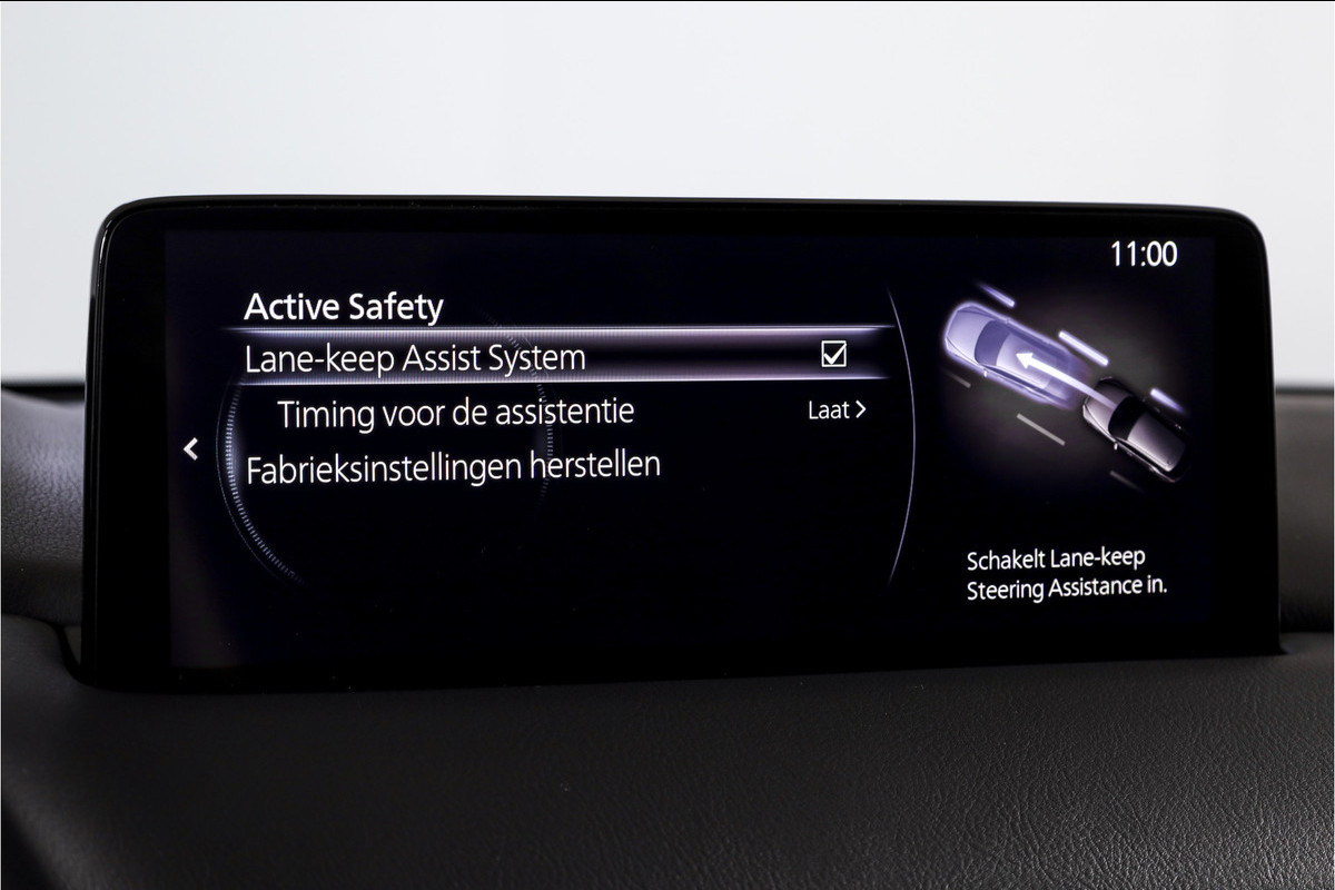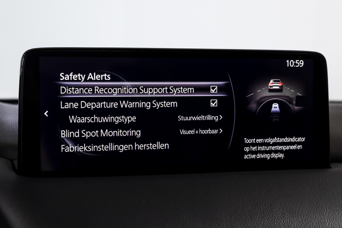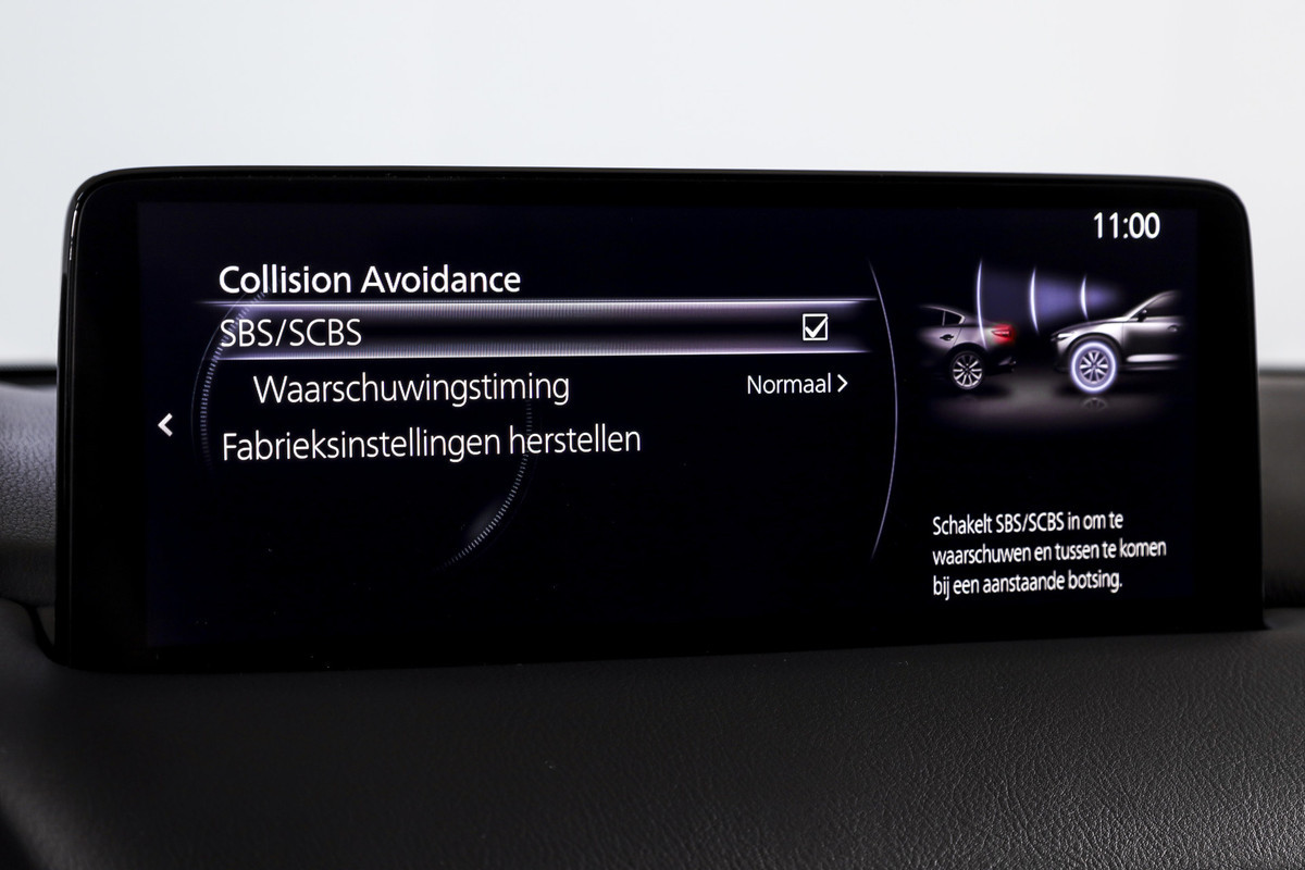 Als bestuurder van deze Mazda bent u nooit alleen. U wordt onderweg bijgestaan door technologische hulpmiddelen die samen met u de weg in de gaten houden. Als het nodig is, grijpen ze zelfs in, door te remmen of bij te sturen. Jachtvliegers doen het al jaren, maar u kunt het nu ook: met de head-up display functie-informatie aflezen zonder uw ogen van de weg te halen. Een belangrijke bijdrage aan de veiligheid onderweg levert de verkeersbord-detectie in deze Mazda. Het Lane-keeping systeem zorgt voor een automatisch constante positie binnen de rijstrook. Afdwalen is uitgesloten. Bovenop deze veiligheidsfeatures heeft deze Mazda bovendien dodehoekdetectie, forward collision warning system, hill hold functie, brake assist, vermoeidheidsherkenning en bandenspanningcontrolesysteem.