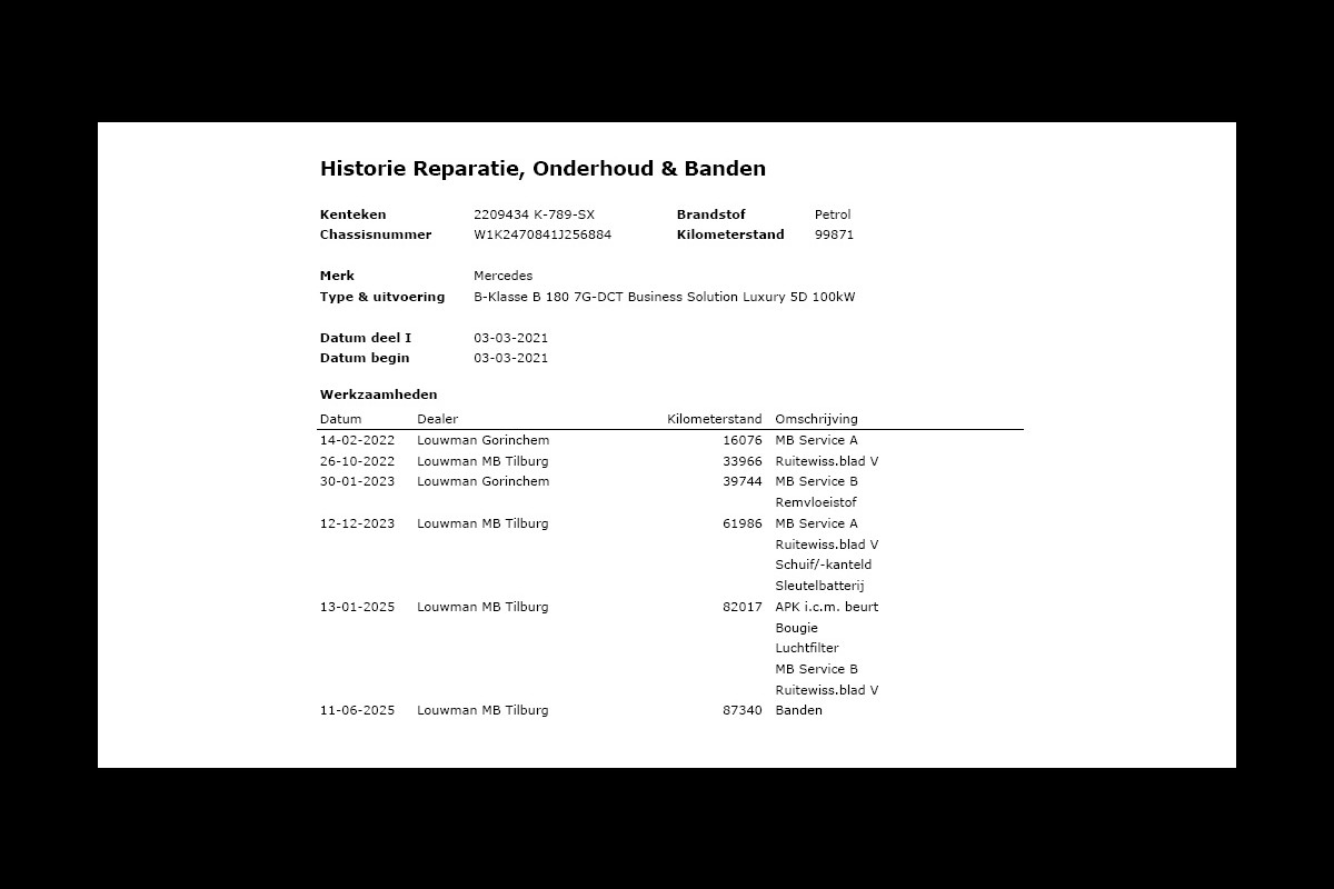 Prestaties op hoog niveau, een onderscheidende, stijlvolle carrosserie en een ruim en comfortabel interieur, het zijn de eigenschappen waarmee auto's als deze Mercedes-Benz B-klasse hun reputatie hebben gevestigd. De aandrijving van deze Mercedes-Benz wordt verzorgd door een viercilinder benzinemotor en een automatische transmissie. Houdt u van een luxe uitstraling? Dan is het lederen interieur een heel aantrekkelijke extra! U past de stoelen moeiteloos aan, ze zijn elektrisch in te stellen en hebben bovendien een geheugen. Dat noemen ze nou een ruimtelijk effect: het elektrisch bediende glazen panoramadak. De achterklep opent automatisch met een druk op de knop. Handig als u met volle handen staat. De koplampen zijn voorzien van matrix LED-verlichting waarmee u aanzienlijk verder kan kijken in het donker. Het systeem past zelf de lichtstraal aan op het moment tegenliggers verblind kunnen worden. Ook 17 inch lichtmetalen velgen, getint glas, in delen neerklapbare achterbank, LED-achterlichten en verstelbare lendensteunen zijn aan boord.
