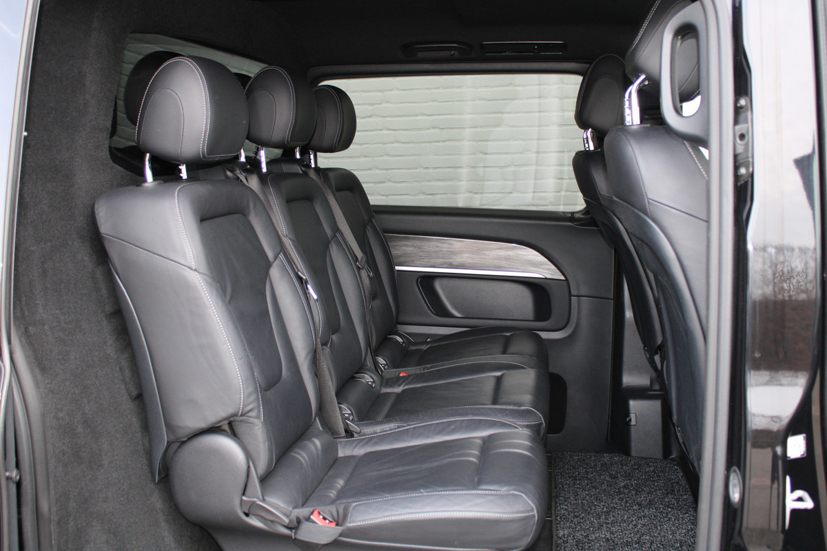 Dynamische styling, zorgvuldig afgewerkt met fraaie materialen en ontworpen met oog voor detail. De Mercedes-Benz V-klasse is van binnen en van buiten een toonbeeld van Duits design. In deze auto vindt u een dieselmotor en een automatische transmissie. Met het lederen interieur ervaart u direct het gevoel van luxe en comfort. Voorin is het 's winters genieten met de verwarmbare voorstoelen voor zowel bestuurder als bijrijder. De comfortstoelen van deze Mercedes-Benz V-klasse staan bekend om zijn goede zithouding. Een handige voorziening op deze auto is de elektrische achterklep die u op afstand kunt openen. Met de krachtige xenonverlichting rijdt u ontspannen in het donker. Onverhoeds de deur opengooien is een risico voor passerend verkeer. De schuifdeur aan de zijkant is dus gemakkelijker én veiliger. De uitmonstering van deze auto wordt gecompleteerd door onder meer LED koplampen, adaptief dempingsysteem, warmtewerend glas, zwarte hemelbekleding, LED-achterlichten en verwarmde ruitensproeiers.